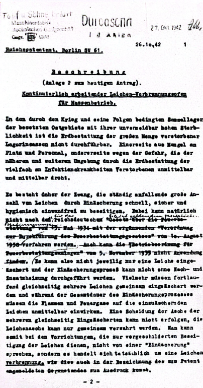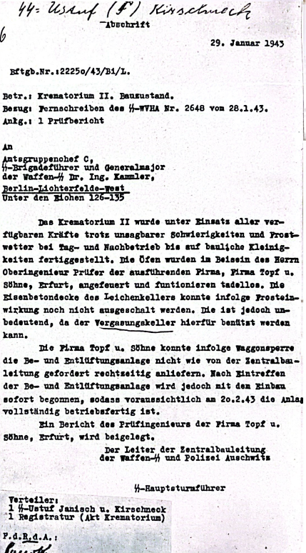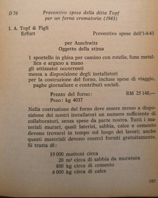 All’inizio del 1943 vennero solennemente inaugurati, alla presenza di autorità giunte appositamente da Berlino, i due primi crematori [della Ditta Topf & Figli di Erfurt], veri e propri capolavori di tecnica assolutamente nuova […].