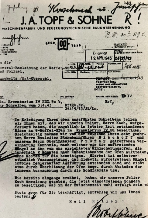 Malgrado gli sforzi delle SS di distruggere le prove della «soluzione finale» facendo saltare i forni crematori e le camere a gas di Auschwitz, i soldati dell’Armata Rossa riuscirono comunque a rinvenire, dopo la liberazione del campo nel gennaio del 1945, la documentazione attestante il commissionamento alla «impresa Topf & Figli di Erfurt della costruzione di potenti forni crematori». Nell’aprile dello stesso anno, le truppe americane liberarono Buchenwald, premurandosi di filmare ciò che, increduli, trovarono all’interno del campo: non solo le masse di cadaveri e i corpi martoriati dei prigionieri, ma anche i forni crematori, sui quali campeggiava l’insegna «Maschinenfabrik J. A. Topf & Söhne».