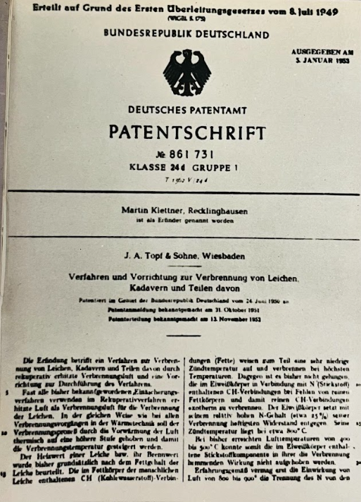 All’inizio del 1961, esce in Germania il libro fotografico Hitler. Aufstieg Und Untergang Des Dritten Reiches di Robert Neumann e Helga Koppell. Il volume pubblica per la prima volta le immagini del brevetto n. 861.731 del 1953 con cui la Topf & Figli di Wiesbaden depositava un modello innovativo dei suoi forni crematori per il rilancio dell’azienda. In un opuscolo pubblicitario diramato dall’azienda proprio in quell’anno si legge: «Settantacinque anni di forni Topf, di prima qualità e frutto di una lunga esperienza».