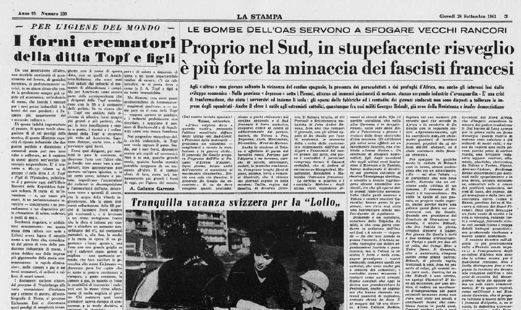 Nei primi anni Sessanta, anche in Italia arrivano notizie di questa vicenda. A pagina 3 della «La Stampa» del 28 settembre 1961, Alessandro Galante Garrone firma I forni crematori della ditta Topf e figli. L’articolo dimostra quanto ampia e duratura sia stata la eco generata dal caso Topf in Europa.
