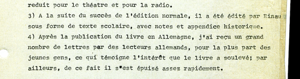 In una lettera datata 3 marzo 1979 Primo Levi approfitta per chiedere un favore all’amico: vorrebbe che gli facesse da mediatore con la casa editrice Fischer per contrattare una ristampa (venne a conoscenza di questa informazione grazie ad una lettera con il suo traduttore tedesco Heinz Riedt) di Se questo è un uomo. Nell’allegato da spedire a Fischer, Levi insiste su due punti cruciali: il successo del libro nelle scuole italiane e le lettere ricevute dai giovani tedeschi.