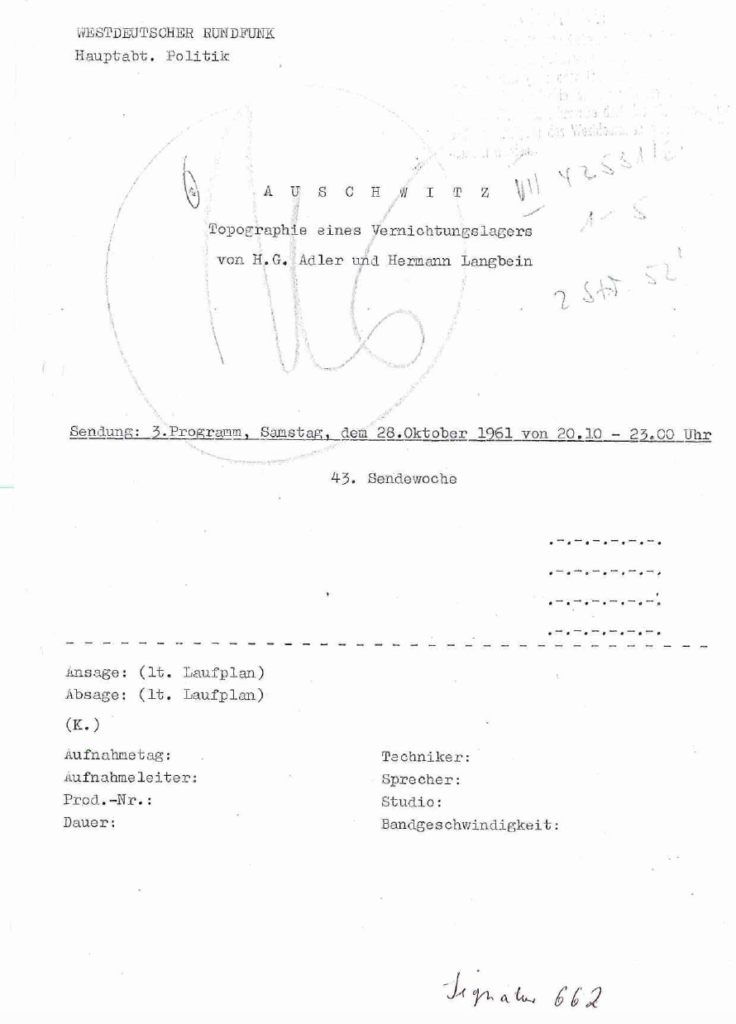 Nel 1961, contribuì alla realizzazione del programma radiofonico dal titolo: Topographie eines Vernichtungslagers, “Topografia di un campo di sterminio”. Fu uno dei primissimi esempi di divulgazione radiofonica sul sistema concentrazionario nazista, che venne mandato in onda appena prima dello svolgimento dei processi di Francoforte (1963-65).