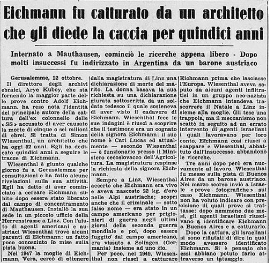 Articolo a pagina 5 de «Lastampa» del 20 ottobro 1960 dedicato alla cattura di Eichmann. Fonte Archivio Storico La Stampa