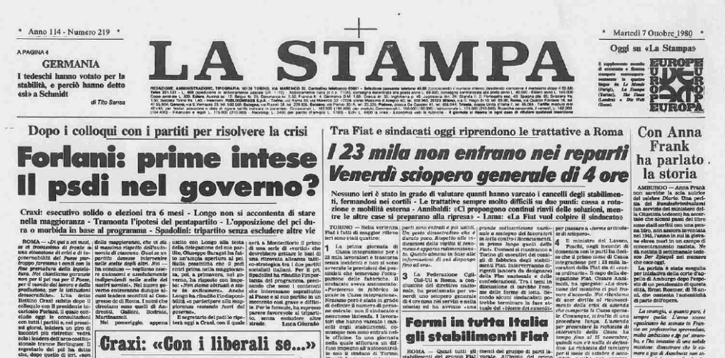 Prima pagina de «La Stampa» del 7 ottobre 1980. Nella colonna di destra l'articolo di Primo Levi Con Anna Frank ha parlato la storia. Fonte Archivio Storico La Stampa