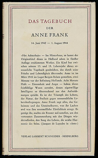 Pubblicato ad Amsterdam nel 1947, il Diario di Anne Frank venne tradotto per la prima volta in Germania nel 1950 dalla casa editrice Lambert Schneider di Heidelberg con il titolo Das Tagebuch der Anne Frank, 12. Juni 1942 - 1. August 1944 e una tiratura di 4500 copie.