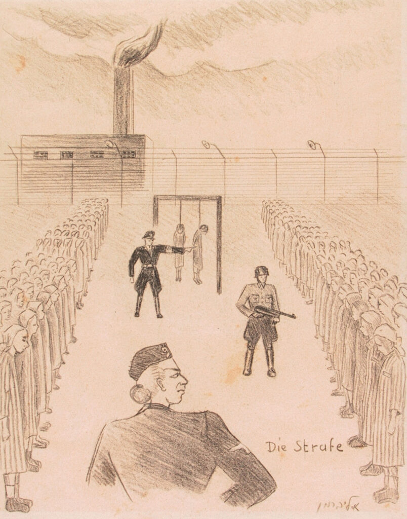 È in fabbrica che Ella entra in contatto con Ala Gartner, originaria di Będzin, ed Ester Wajsblum, due delle quattro giovanissime prigioniere – con Regina Safirsztajn e Ròza Robota – impiccate due per volta il 5 e il 6 gennaio 1945 con l’accusa di aver trafugato, durante il lavoro, il materiale esplosivo utilizzato dal Sonderkommando di Birkenau durante la celebre rivolta dell’autunno del 1944. Ella sarà costretta, come tutte le compagne di Birkenau, tra cui la giovane Liliana Segre, ad assistere all’impiccagione delle due amiche. Più tardi, Ella ricorderà questo momento attraverso un disegno, emblematicamente intitolato “The Punishment”, e dirà: