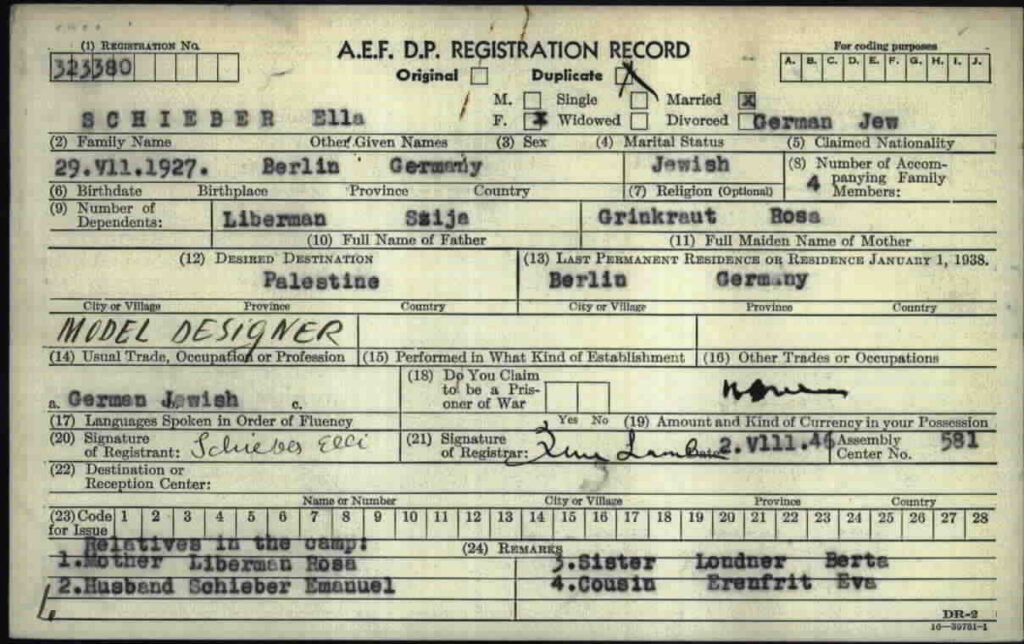 Il 23 maggio 1946, a pochi mesi dal matrimonio, i giovani coniugi, insieme alla madre di Ella, lasciano la Polonia per raggiungere la Germania. È qui che in un campo per profughi gestito dall’UNRRA (United Nations Relief and Rehabilitation Administration) nei pressi di Monaco, ritrovano Bertha, sorella di Ella e unica della famiglia ad essere sopravvissuta ai campi di concentramento, ed Eva, una sua cugina.