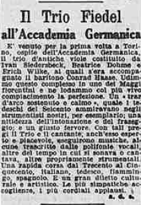 Dettaglio dell'indirizziario della città di Monaco di Baviera del 1930. Presso l'interno 2 della Schönfeldstraße 10 risultano residenti Viktor E. Mertens, Medico; Gertrud [Mertens], cantante da concerto; Beatrice Dohme, violinista. Fonte Adreßuchfür Münchenund Umgebung1930, p. 817.«La Stampa» Torino, 26 aprile 1942. Fonte Archivio Storico «La Stampa»