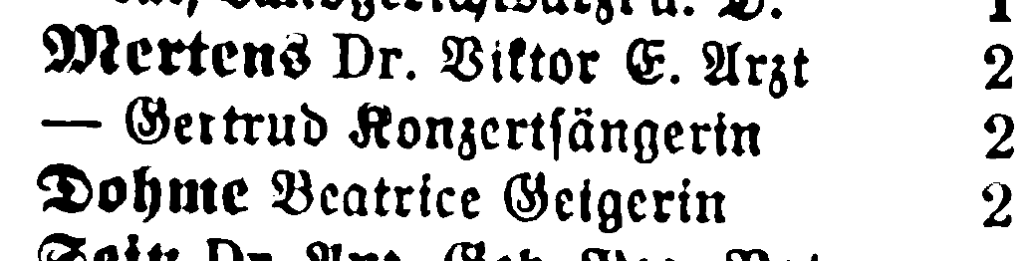 I Mertens non avranno figli. Tuttavia, negli anni Venti diventeranno i tutori della violinista Beatrice Dohme (1908-1986 ca.), figlia dell’importante imprenditore farmaceutico statunitense Alfred Robert Louis Dohme (1867-1952). Spirito ribelle, era stata affidata dai genitori alla rigida istruzione di un collegio di suore a Monaco, da cui Beatrice ben presto fuggì, facendo perdere le proprie tracce. Sarà la sua insegnante di musica Gertrud Mertens – da lei teneramente soprannominata “Frau Mimi” – a prenderla sotto la sua ala e a farla riappacificare con la famiglia. Considerata e cresciuta come una figlia, la giovane vivrà nell’appartamento dei Mertens, dedicandosi agli studi musicali.