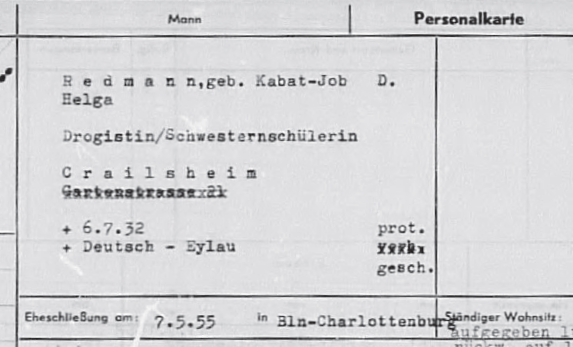 Dettaglio della scheda anagrafica di Helga Redmann inviataci dall'archivio cittadino di Crailsheim