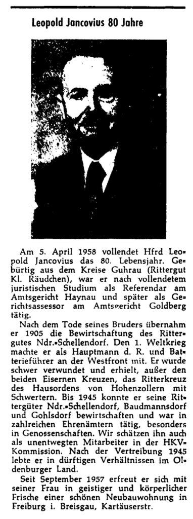 Trafiletto su Leopold Jancovius in occasione del suo ottantesimo compleanno, comparso sul Goldberg-Haynauer Heimat-Nachrichten (“Goldberg-Haynauer Notizie locali”) del 15 marzo 1958, mensile degli abitanti tedeschi espulsi dal distretto della Slesia di Goldberg-Haynau.