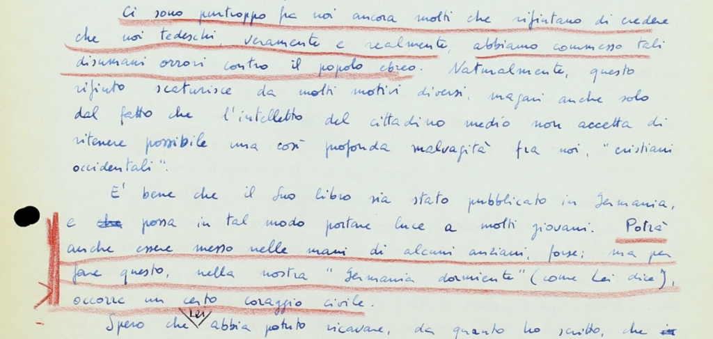 «Mi ha piuttosto stupito la Sua frase in cui Ella accenna al “Zivilcourage” necessario a fare leggere libri come il mio a certi tedeschi. Quali sono questi tedeschi? e quanti sono? quale peso hanno nella Germania di oggi? [...] se coraggio occorre, è un coraggio che è necessario avere: poiché la verità è la medicina di cui la Germania e il mondo hanno oggi più bisogno».