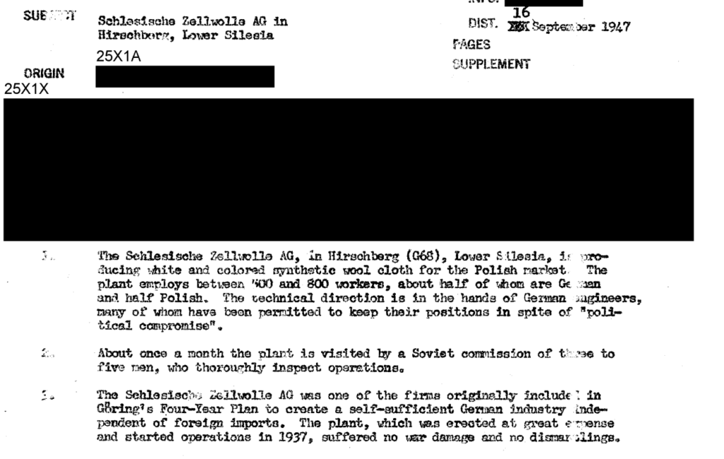 Le informazioni relative alla Schlesische Zellwolle sono state principalmente tratte dalla scheda archivistica della società in oggetto consultabile negli Archivi storici della stampa del XX secolo del Leibniz-Informationszentrum Wirtschaft (Centro di informazione Leibniz per l’economia), URL: https://pm20.zbw.eu/folder/co/0443xx/044336/about.de.html; dal portale KuLaDig del Landschaftsverband Rheinland (Associazione regionale della Renania), URL: https://www.kuladig.de/Objektansicht/KLD-252442#id2; e ancora dal documento del 1947 della Central Intelligence Group degli Stati Uniti consultabile sul sito della CIA, URL: https://www.cia.gov/readingroom/docs/CIA-RDP82-00457R000900220001-1.pdf.