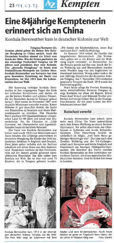Le informazioni sulla vita di Kordula Bernreuther e della sua famiglia sono state ricavate attraverso alcuni scambi con il figlio Florian, e soprattutto attraverso il suo libro: Florian Bernreuther, Mutter(n) auf Tour(en). Von China ins Allgäu: ein Zug durchs Jahrhundert (“Madre/i in viaggio. Dalla Cina all’Algovia: un treno attraverso il secolo”), Fouqué Literatur Verlag 2000. Altre informazioni sono state tratte da un articolo apparso sul quotidiano «Allgäuer Zeitung» di Kempten in occasione del termine del controllo britannico su Hong Kong; cfr s.a, Eine 84jährige Kemptenerin erinnert sich an China (“Una donna di 84 anni di Kempten ricorda la Cina”), in «Allgäuer Zeitung», 1 luglio 1997, p. 23.