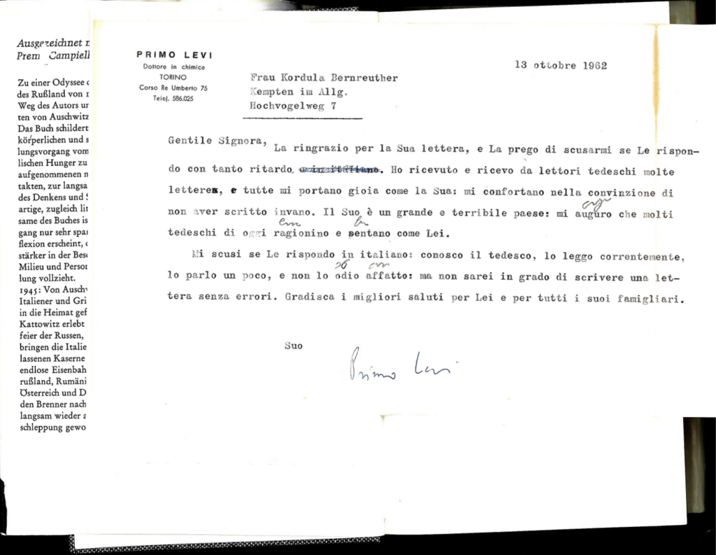 Intorno alla casa dei Bernreuther si crea un piccolo circolo intellettuale frequentato da avvocati, filologi, bibliotecari, e alimentato dal costante impegno di Josef come insegnante all’Università popolare di Kempten. È in questo periodo che Kordula e Josef Bernreuther, come anche i loro figli, leggono Ist das ein Mensch? e che la donna decide di scrivere a Primo Levi a nome di tutta la famiglia. Il contatto epistolare con l’autore di Se questo è un uomo sarà un argomento di cui si parlerà molto in famiglia, cosa che si evince dalla lettera inviata da Kordula (cfr. Lettera 106) e che ha trovato conferma in una testimonianza fattaci dal figlio Florian. Kordula conserverà la lettera di risposta di Primo Levi all’interno dell’edizione tedesca de La tregua (Die Atempause), uscita nel 1964.