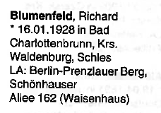 Il secondogenito Richard Blumenfeld non avrà la stessa fortuna dei fratelli e della sorella: resterà infatti all’Auerbach sino al 19 ottobre 1942, quando insieme con 60 bambini e 3 educatori sarà deportato nel ghetto di Riga con l’Osttransport 21, uno dei molti convogli utilizzati per il trasferimento degli ebrei tedeschi nei ghetti dei paesi baltici. Sull’Osttransport 21 furono stipate 959 persone, con un’età media di 36,7 anni. All’arrivo a Riga, dopo tre giorni di viaggio, solo 81 uomini adulti vennero selezionati per il lavoro forzato nelle strutture industriali belliche che gravitavano attorno al ghetto. Tutti gli altri, compresi i bambini, furono fucilati nelle foreste di Rumbula e Biķernieki.
