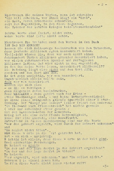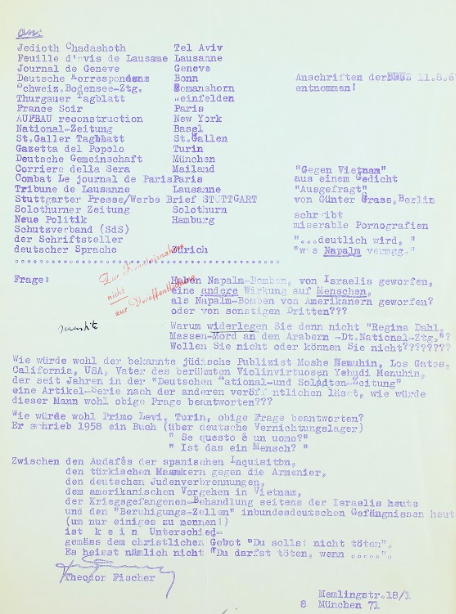 Nell’agosto del 1967, Fischer scrive nuovamente a Primo Levi, inviandogli la copia di una lettera aperta da lui indirizzata a vari quotidiani tedeschi, svizzeri, francesi, italiani e israeliani.