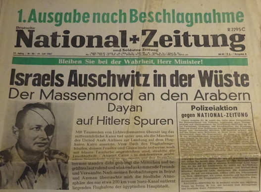 Nella primavera-estate del 1967, la National-Zeitung adottò una linea editoriale martellante, interamente improntata all’identificazione di Israele con il Terzo Reich e alla denuncia del presunto atteggiamento compromissorio della Repubblica Federale. Di seguito, alcuni titoli: Hitler e Adenauer. Il potere degli ebrei in Germania. È possibile “riparare” Auschwitz? (12 maggio); La lotta di Brandt per Israele (Brandts Kampf, 2 giugno); Il colpevole è Israele. Il tradimento di Bonn nei confronti degli arabi (9 giugno); I crimini di Israele: ecco come viene ingannato il mondo. La verità sul conflitto in Medio Oriente (16 giugno); Israeliani, espiate i vostri crimini. L’agonia degli arabi (30 giugno); I nazisti di Israele. Bonn continua a finanziare i crimini di Israele? (7 luglio).