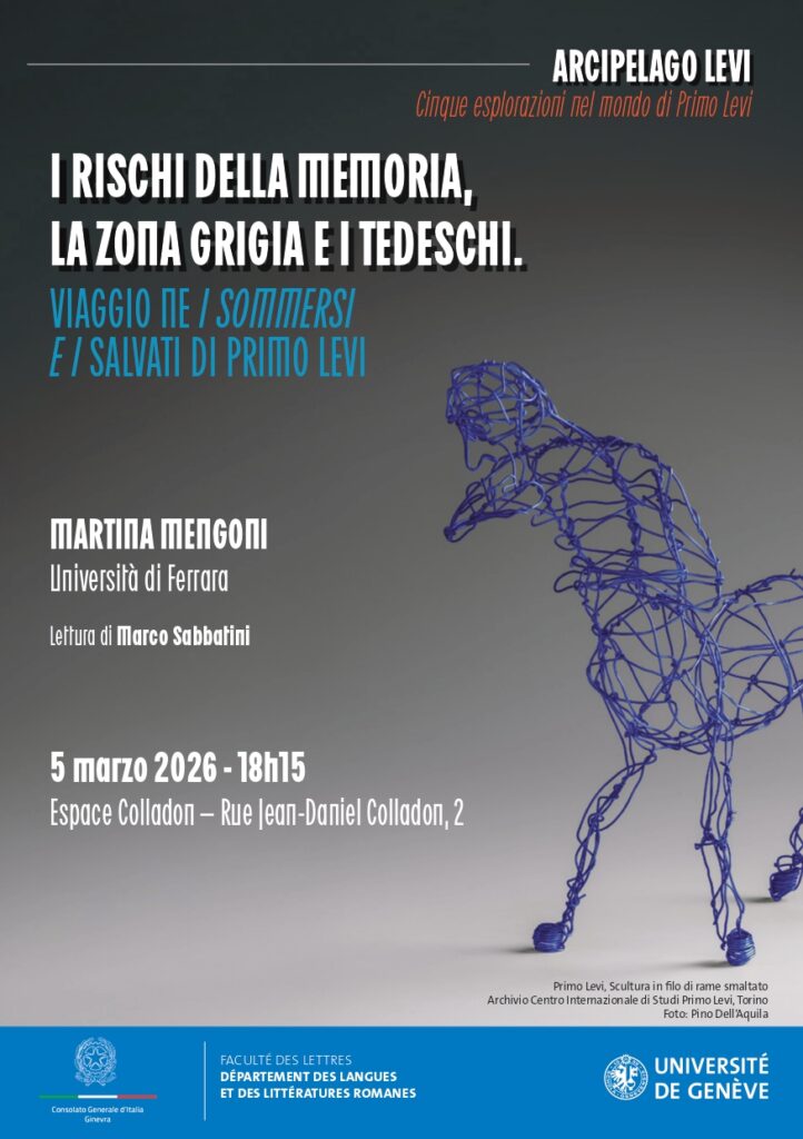 Giovedì 5 marzo 2026 alle ore 18:15 Martina Mengoni interverrà nel ciclo di conferenze organizzato dalla facoltà di Lettere dell’Università di Ginevra dal titolo Arcipelago Levi. Cinque esplorazioni nel mondo di Primo Levi. In questa occasione si parlerà dei Sommersi e i salvati, del capitolo «Lettere di Tedeschi» e del progetto LeviNeT.