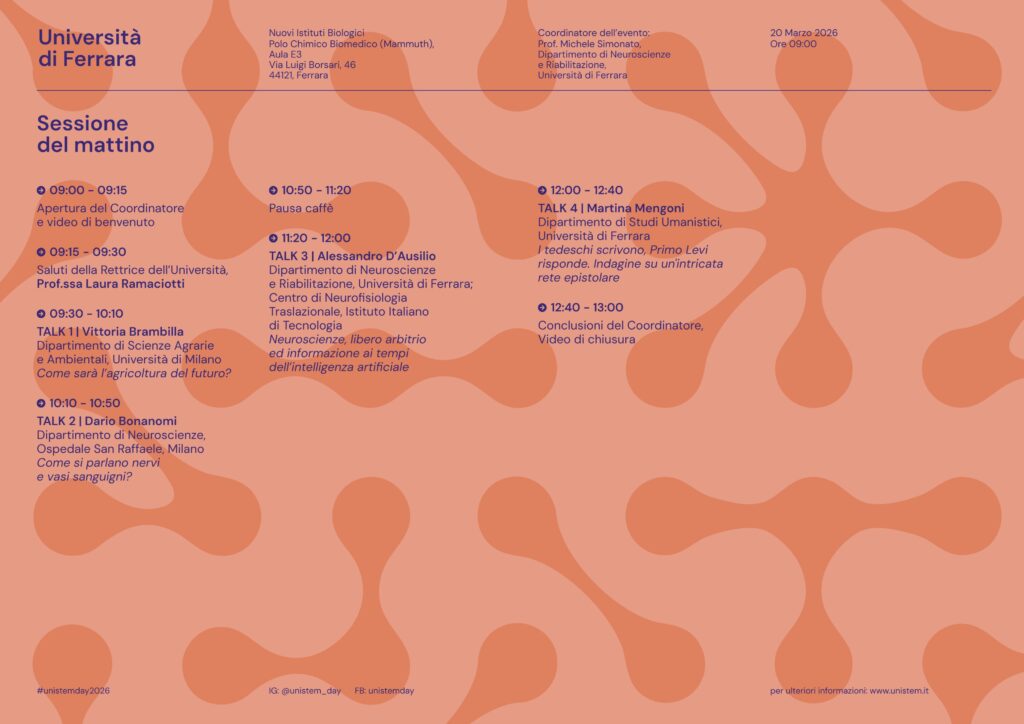 Venerdì 20 marzo 2026 alle ore 12:00 Martina Mengoni presenterà il progetto LeviNeT nell’ambito dell’UniStem Day 2026, la giornata dedicata agli studenti delle scuole superiori che si svolgerà in 93 Università e Istituiti di ricerca nel mondo. L’evento si terrà presso il Polo Chimico Biomedico (Mammuth) dell’Università di Ferrara.