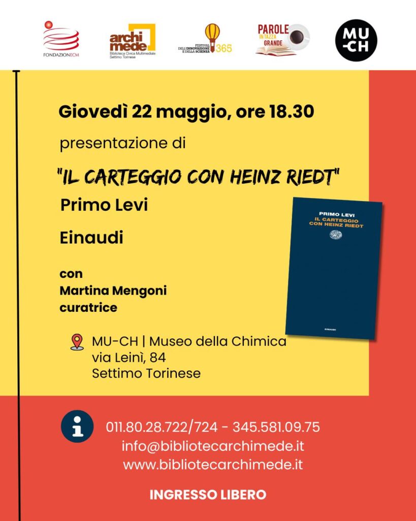 Giovedì 22 maggio 2025 alle 18.30 Martina Mengoni presenterà il carteggio tra Primo Levi e Heinz Riedt al MU-CH, Museo della Chimica di Settimo Torinese, ex fabbrica di vernici S.I.V.A. dove Levi lavorò tra il 1948 e il 1974.