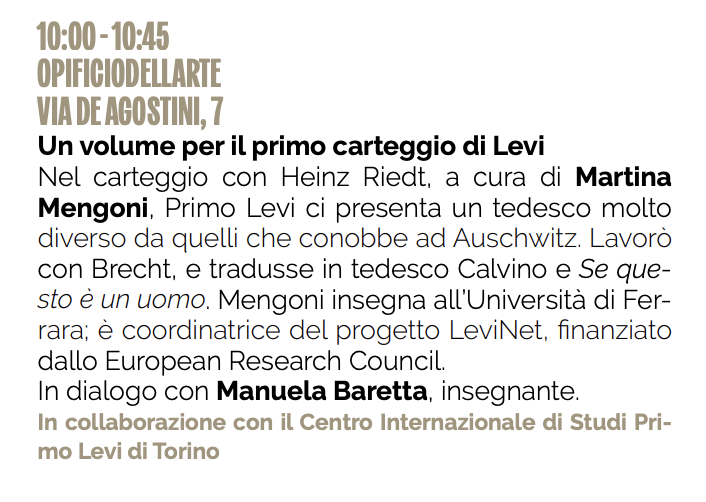 Sabato 6 settembre 2025 alle ore 10:00 Martina Mengoni, in dialogo con Manuela Beretta, presenterà il progetto LeviNeT e il carteggio con Heinz Riedt nella cornice dell’11ª edizione edizione del Festival Letterario della Città di Biella. L’incontro è organizzato in collaborazione con il Centro Internazionale di Studi Primo Levi di Torino