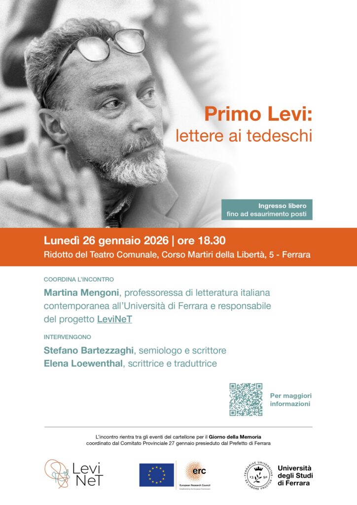 Lunedì 26 gennaio 2026 alle ore 18.30 Martina Mengoni dialogherà con Stefano Bartezzaghi e Elena Loewenthal nel corso di una conferenza dal titolo Primo Levi: lettere ai tedeschi, che si terrà al Ridotto del Teatro Comunale di Ferrara. L’iniziativa è organizzata dall’Università di Ferrara nel quadro delle attività per il Giorno della Memoria.