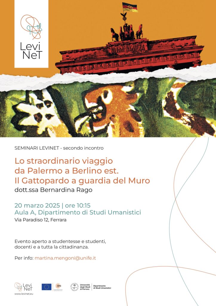 Giovedì 20 marzo 2025 alle ore 10:15 si terrà il secondo incontro del ciclo di Seminari LeviNeT. Ad intervenire sarà la dott.ssa Bernardina Rago, autrice del libro Il Gattopardo a guardia del muro. Storia di un giallo letterario nella Germania socialista (Feltrinelli 2024), che racconta come, mentre in Italia teneva banco la polemica politica sul romanzo, la DDR promosse il romanzo di Lampedusa e ne fece un libro chiave del Risorgimento italiano in chiave socialista. Come questo sia stato possibile e attraverso quali vicende di politica editoriale e di appropriazione culturale ciò sia avvenuto, lo spiegherà l’autrice nella sua lezione dal titolo: Lo straordinario viaggio da Palermo a Berlino est. Il Gattopardo a guardia del Muro. L’incontro si terrà al Dipartimento di Studi Umanistici, Aula A (Via Paradiso 12, Ferrara).