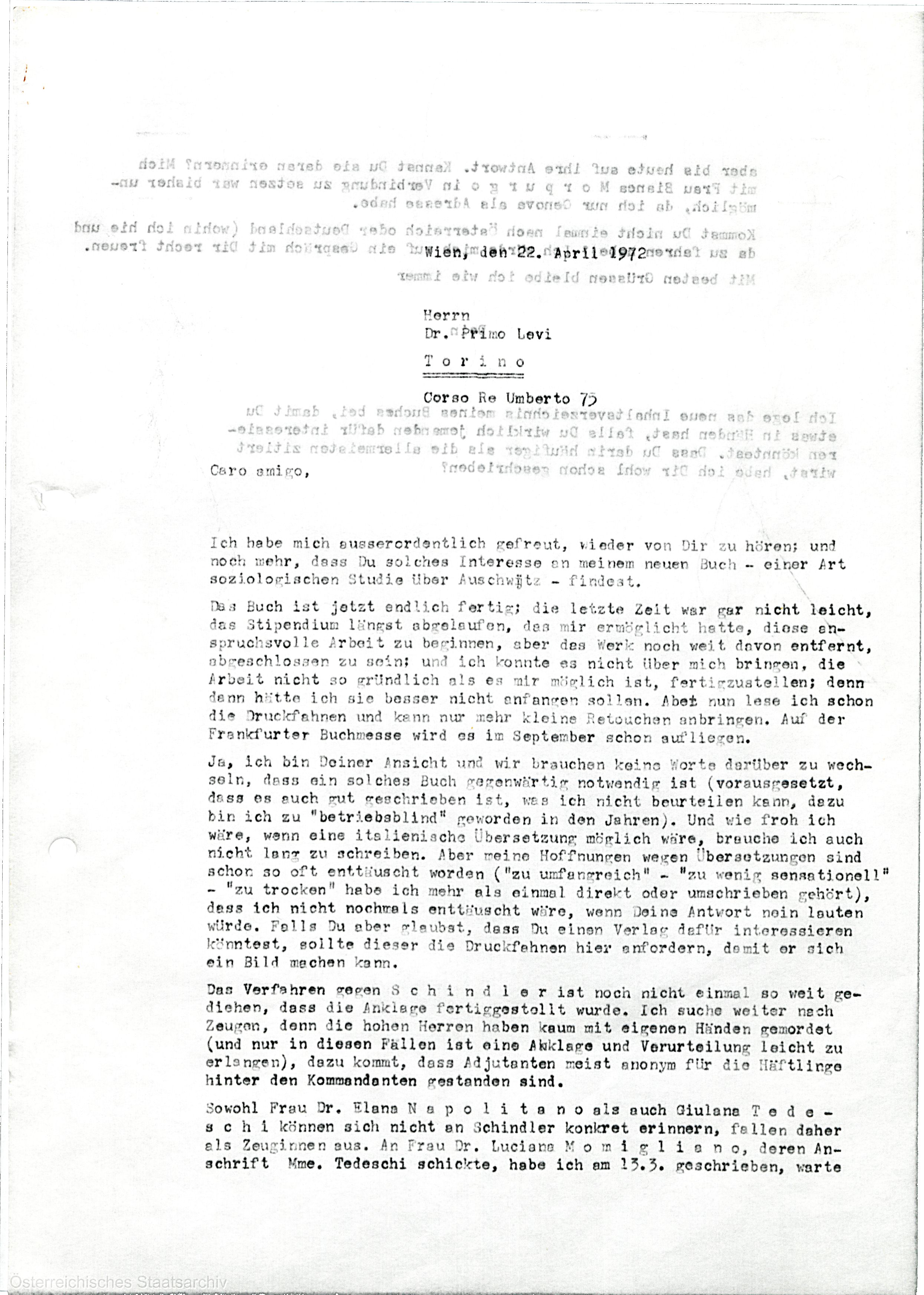 Langbein brings Levi up to date on Menschen in Auschwitz (People in Auschwitz), which will be released after the summer. He discusses the possibility of an Italian translation, and gives him news about the Schindler trial.