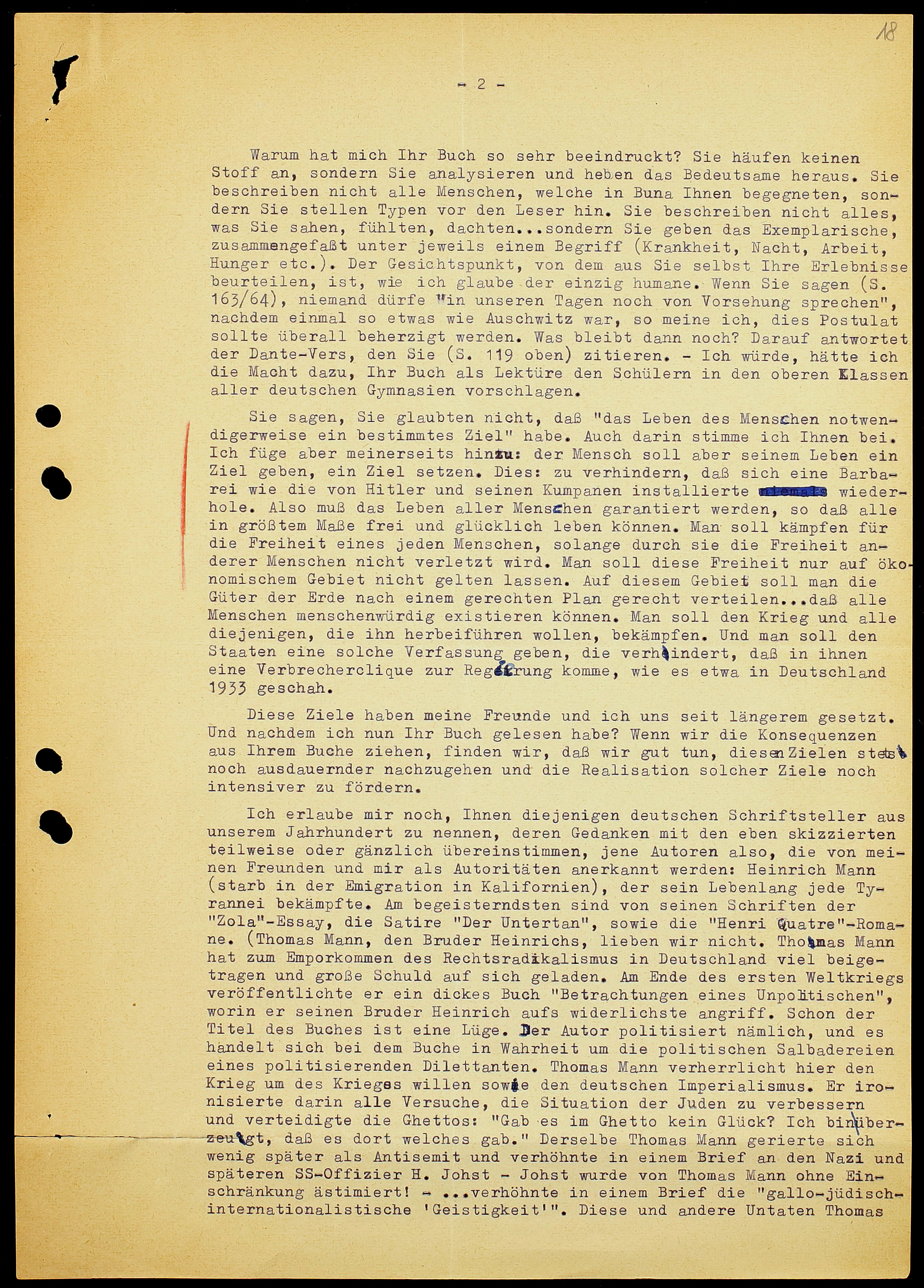 Come studioso di storia e letteratura tedesca io ho letto una quantità di libri. Pochi mi hanno colpito come il suo libro. Le sono grato di ciò. E penso che il suo libro rimarrà sempre come un importantissimo documento su un tempo malvagio. SULVIIperiodo malvagio della Germania, su quel tempo nel quale la Germania era il più perverso nemico di milioni di uomini. Durante quei mesi, di cui lei parla, io ho vissuto in Germania orientale, per lo più a Breslavia; dunque a poche centinaia [di]VIIIkm. da Buna.Io non ho saputo niente di Buna: nell’estate del ‘44 andavo ogni giornoIXa nuotare a Breslavia;Xe non ero affatto infelice.XIHo vissuto in parte la guerra tuttavia (e cioè i bombardamenti aerei del ‘39 nel nord della Germania: sono nato nel 1934 ed ero ancora un bambino durante la guerra).XIIE dei grandi delitti che sono stati compiutiXIIIdai tedeschi, non posso farmi alcuna colpa. Ma ho vergogna di questo delitto.[2] Odio i colpevoli, nelle mani dei qualiXIVlei e i suoi compagni soffrirono, e odio ilorocomplici,XVdei quali un buon gruppo vive ancora.