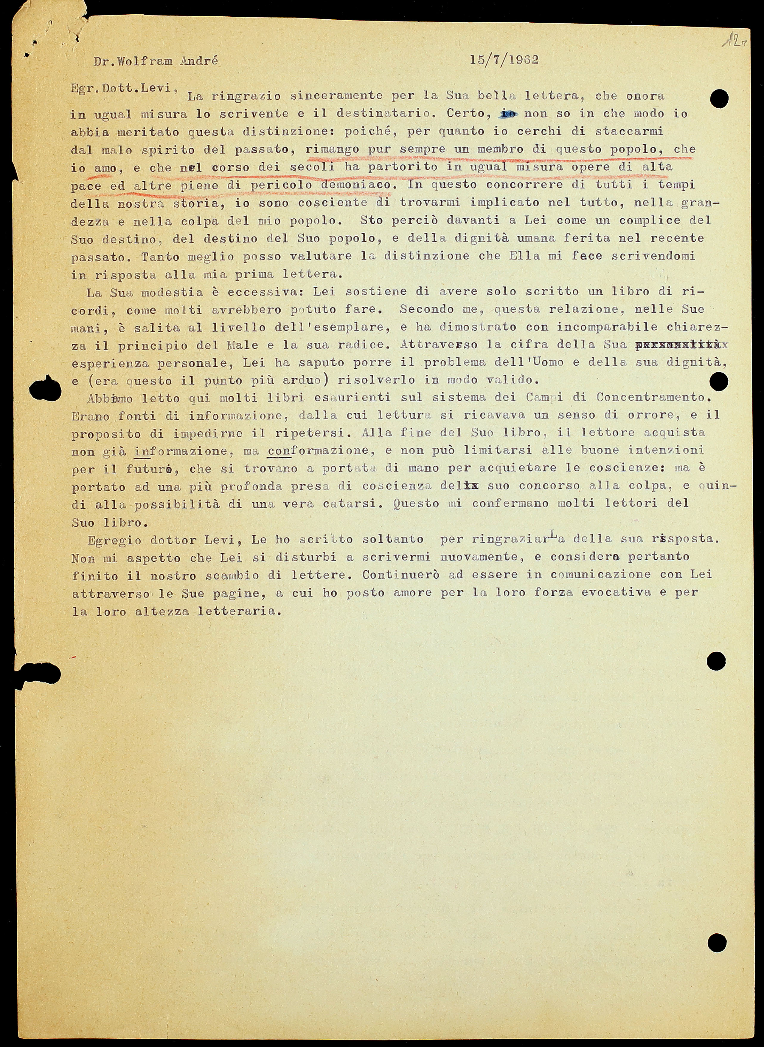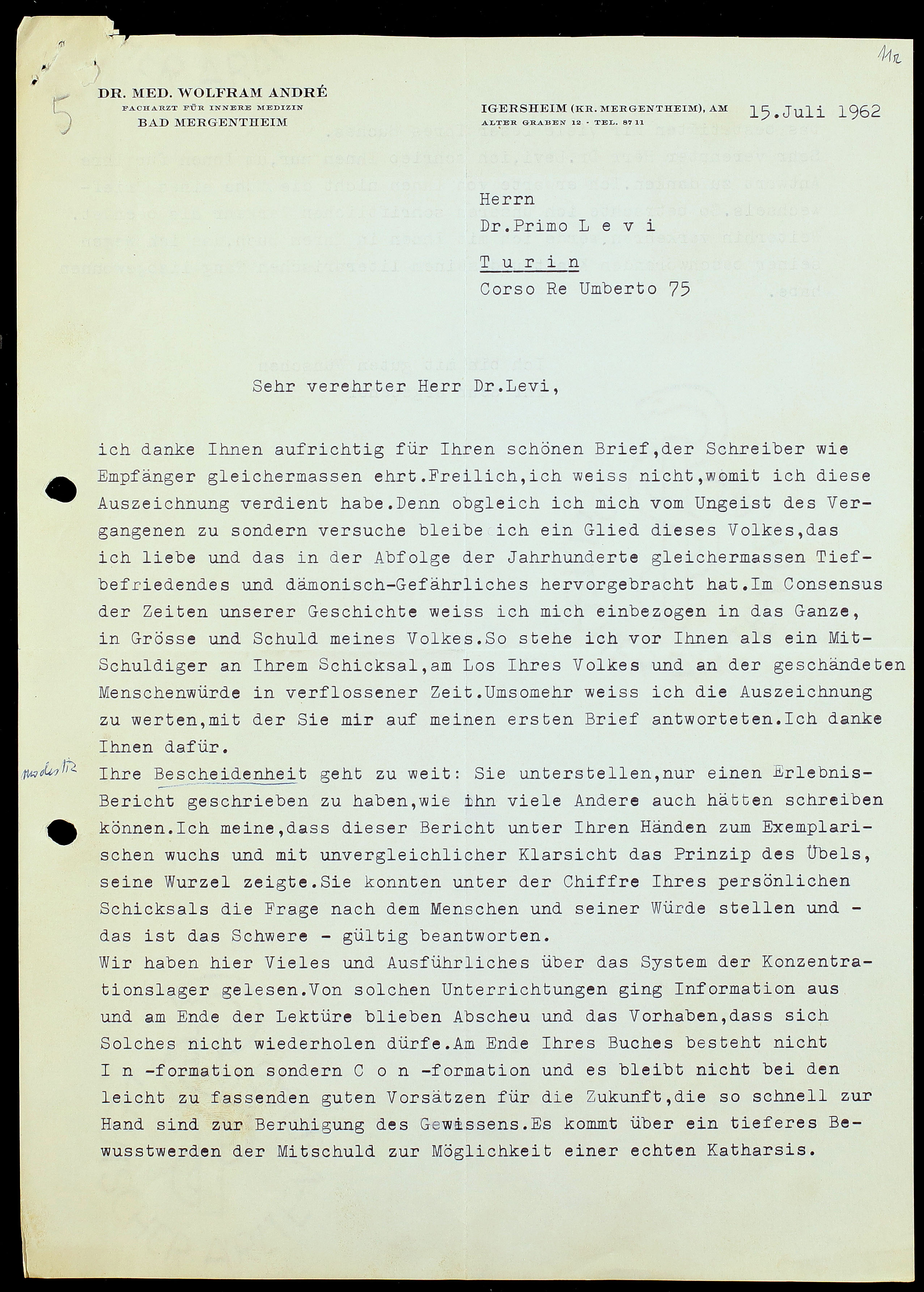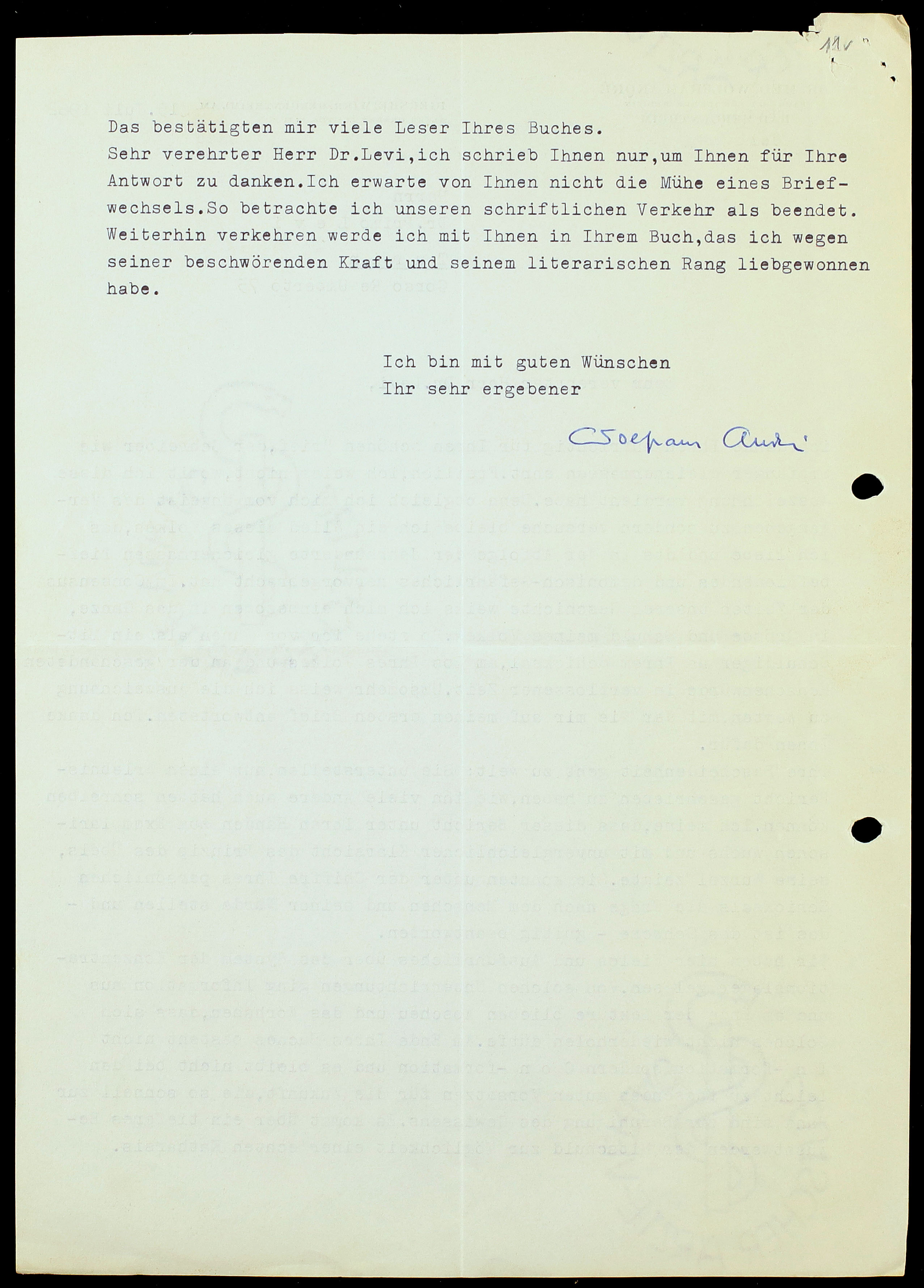 Sehr verehrter Herr Dr. Levi, ich schrieb Ihnen nur, um Ihnen für Ihre Antwort zu danken. Ich erwarte von Ihnen nicht die Mühe eines Briefwechsels. So betrachte ich unseren schriftlichen Verkehr als beendet. Weiterhin verkehren werde ich mit Ihnen in Ihrem Buch, das ich wegen seiner beschwörenden Kraft und seinem literarischen Rang liebgewonnen habe.