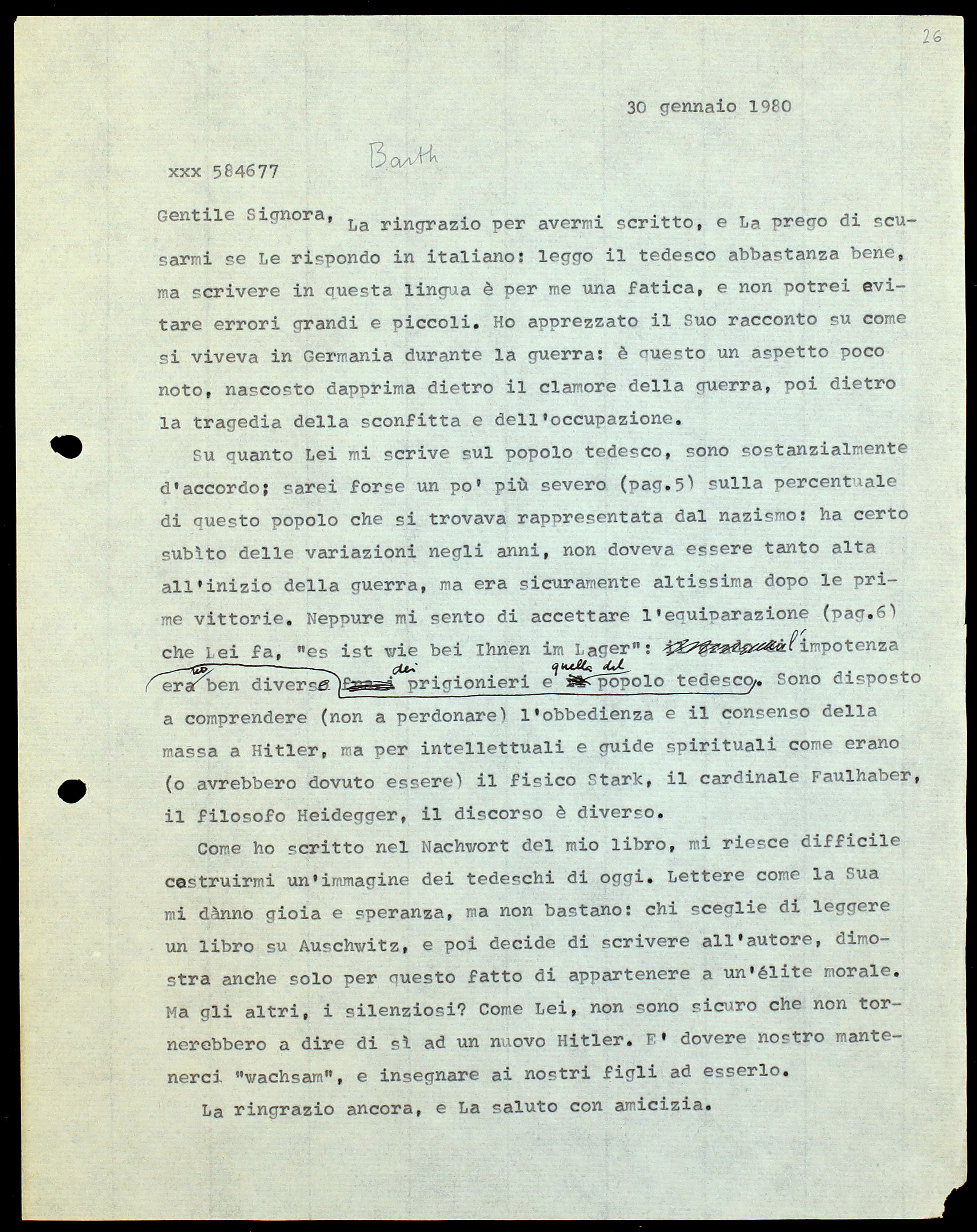 102. Primo Levi a Inge Barth, 30 gennaio 1980