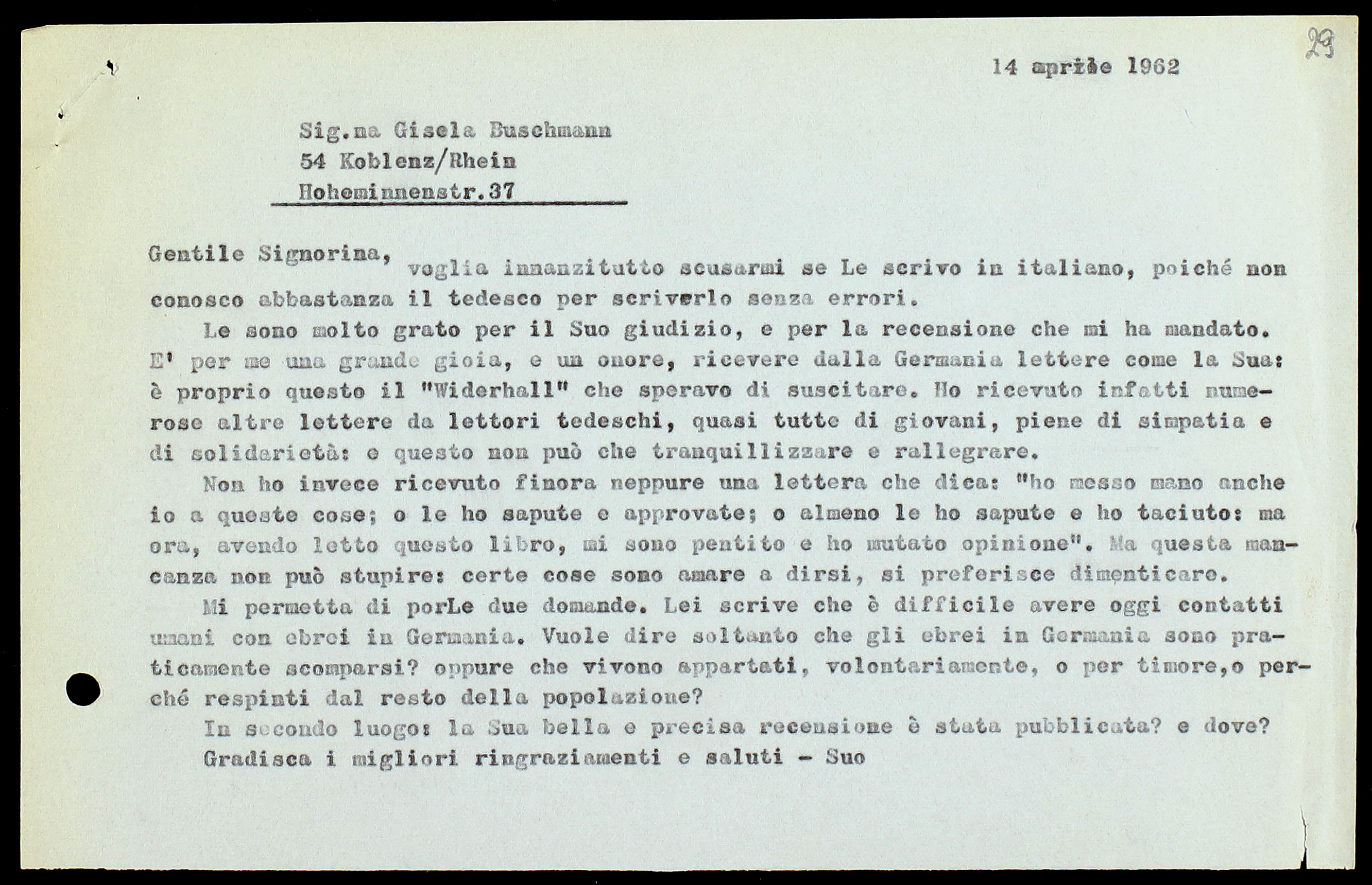 Le sono molto grato per il Suo giudizio, e per la recensione che mi ha mandato. È per me una grande gioia, e un onore, ricevere dalla Germania lettere come la Sua: è proprio questo il “Wiederhall” che speravo di suscitare. Ho ricevuto infatti numerose altre lettere da lettori tedeschi, quasi tutte di giovani, piene di simpatia e di solidarietà: e questo non può che tranquillizzare e rallegrare.