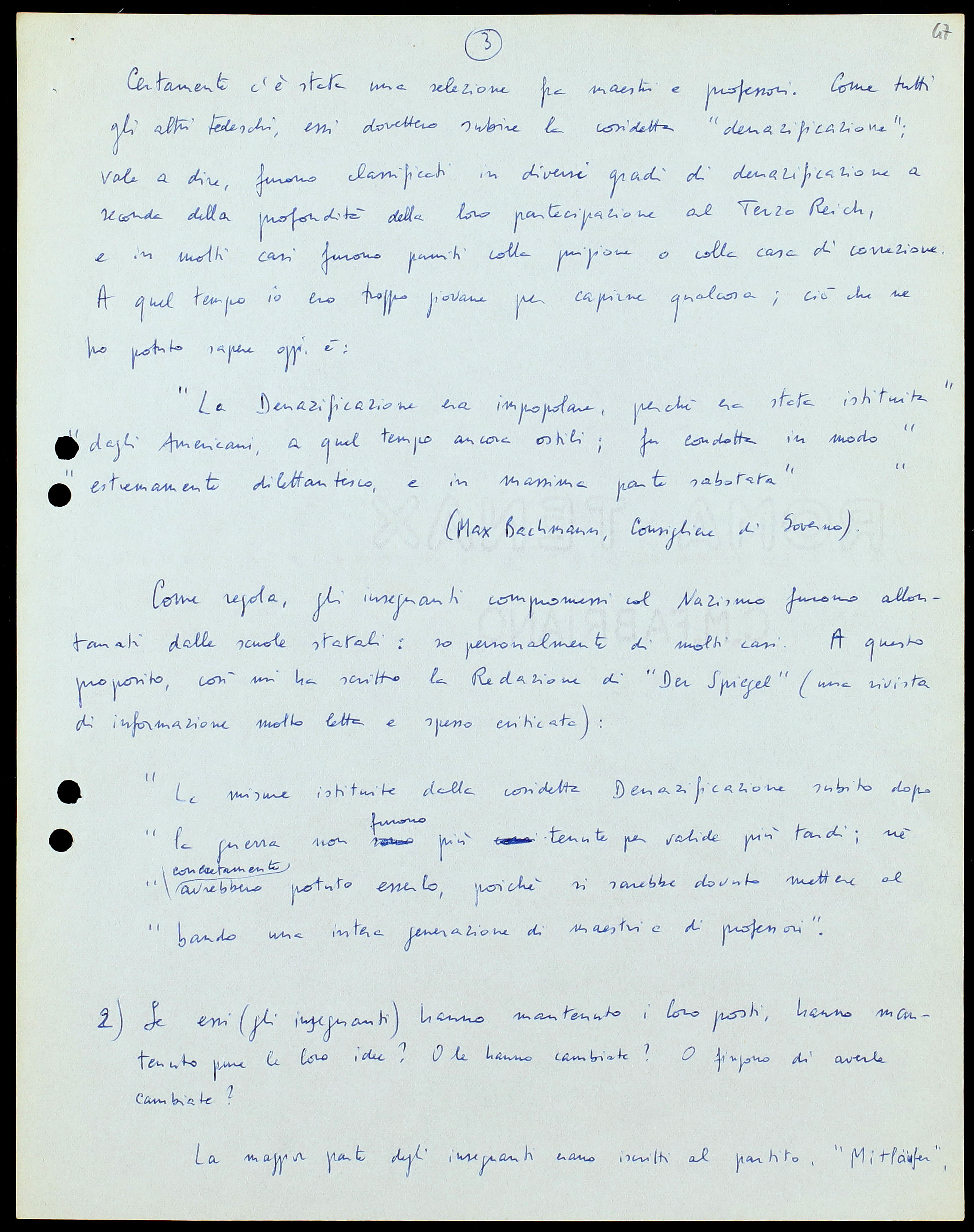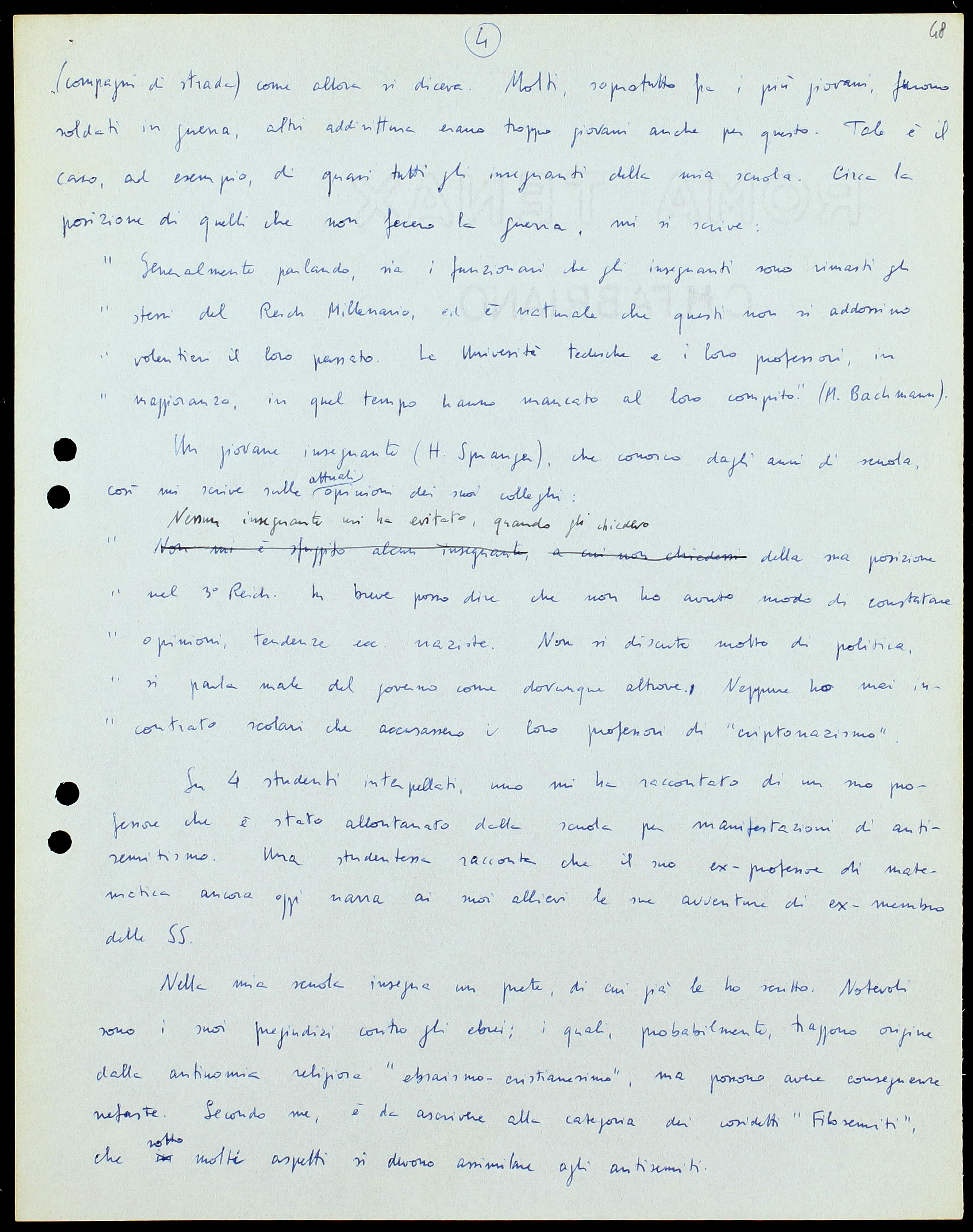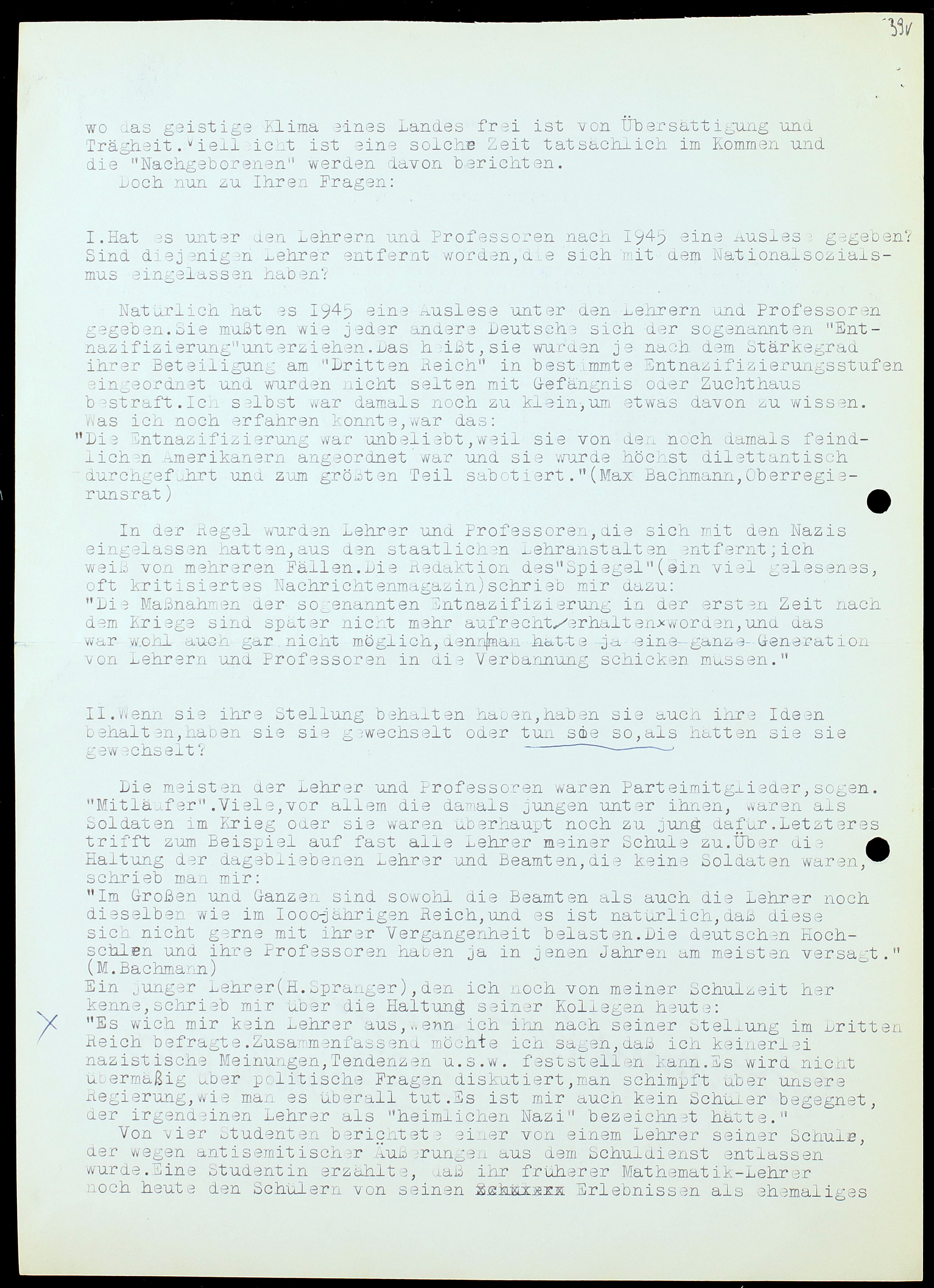 „Im Großen und Ganzen sind sowohl die Beamten als auch die Lehrer noch dieselben wie im 1000-jährigen Reich, und es ist natürlich, daß diese sich nicht gerne mit ihrer Vergangenheit belasten. Die deutschen Hochschlen und ihre Professoren haben ja in jenen Jahren am meisten versast.” (M. Bachmann)[9]