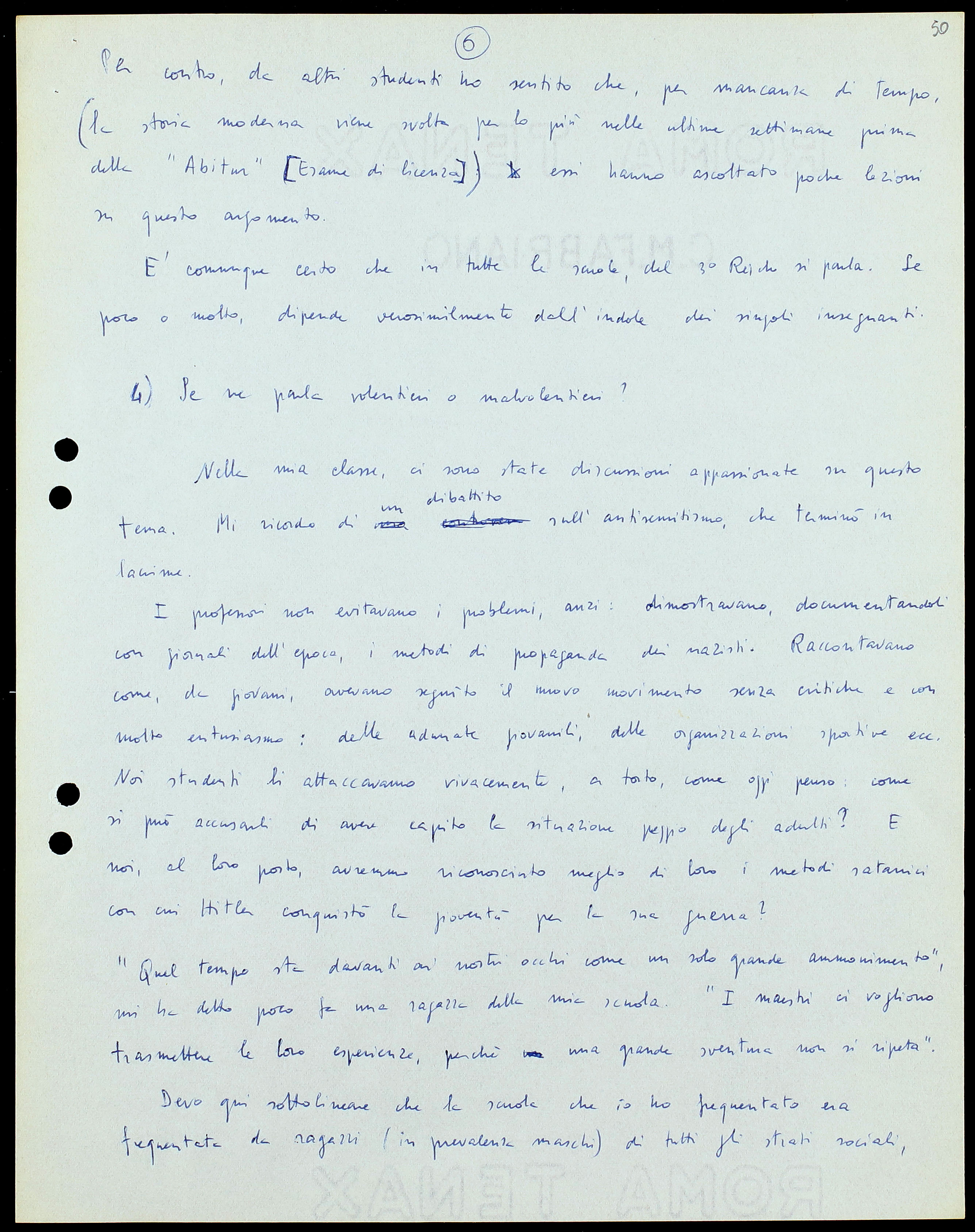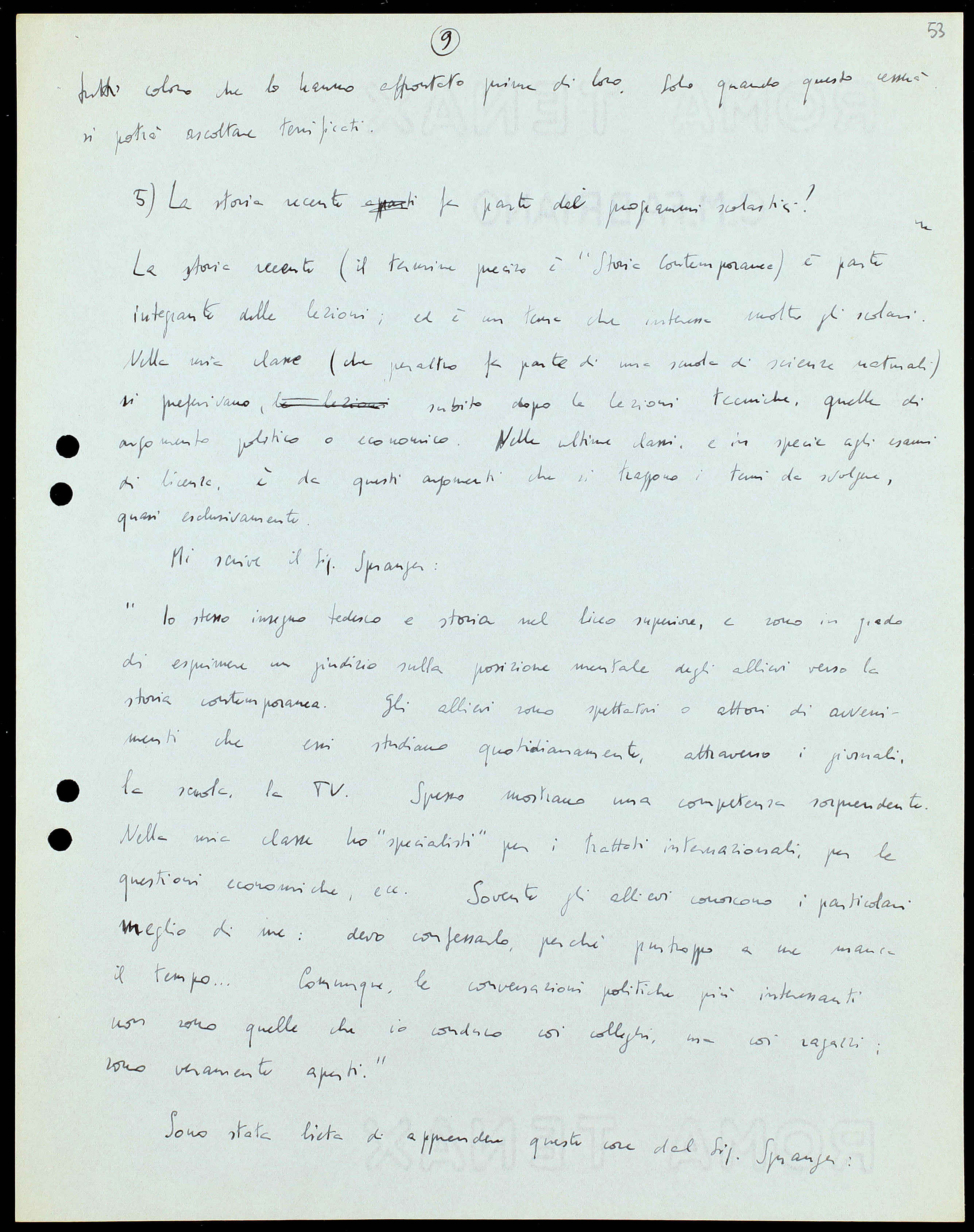 «Io stesso insegno tedesco e storia nel liceo superiore, e sono in grado di esprimere un giudizio sulla posizione mentale degli allievi verso la storia contemporanea. Gli allievi sono spettatori o attori di avvenimenti che essi studiano quotidianamente, attraverso i giornali, la scuola, la TV. Spesso mostrano una competenza sorprendente. Nella mia classe ho “specialisti” per i trattati internazionali, per le questioni economiche, ecc. Sovente gli allievi conoscono i particolari meglio di me: devo confessarlo, perché purtroppo a me manca il tempo… Comunque, le conversazioni politiche più interessanti non sono quelle che io conduco coi colleghi, ma coi ragazzi; sono veramente aperti».