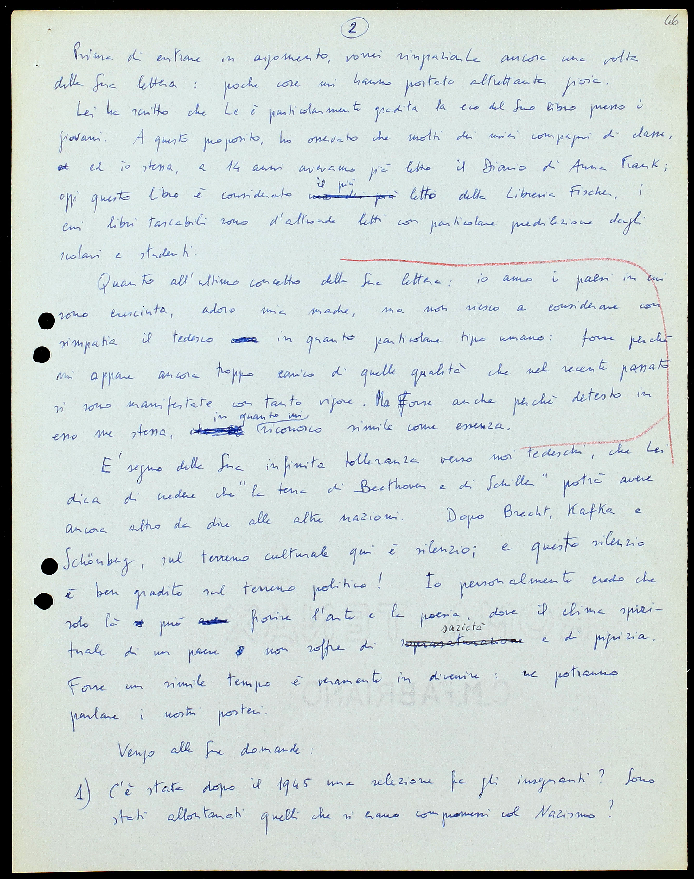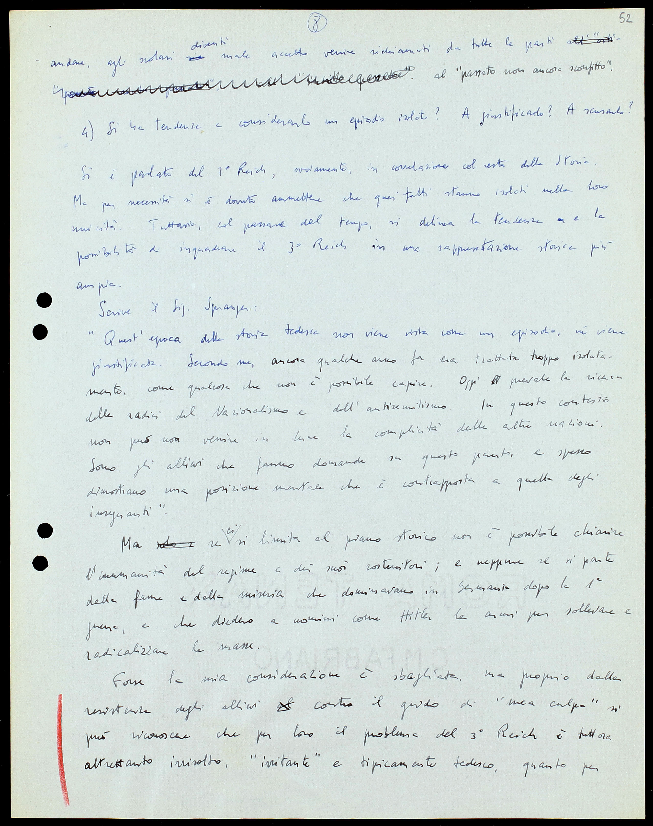 Forse la mia considerazione è sbagliata, ma proprio dalla resistenza degli allievi contro il grido di “mea culpa” si può riconoscere che per loro il problema del 3o Reich è tuttora altrettanto irrisolto, “irritante” e tipicamente tedesco, quanto perX tutti coloro che lo hanno affrontato prima di loro. Solo quando questo cesserà si potrà ascoltare terrificati.