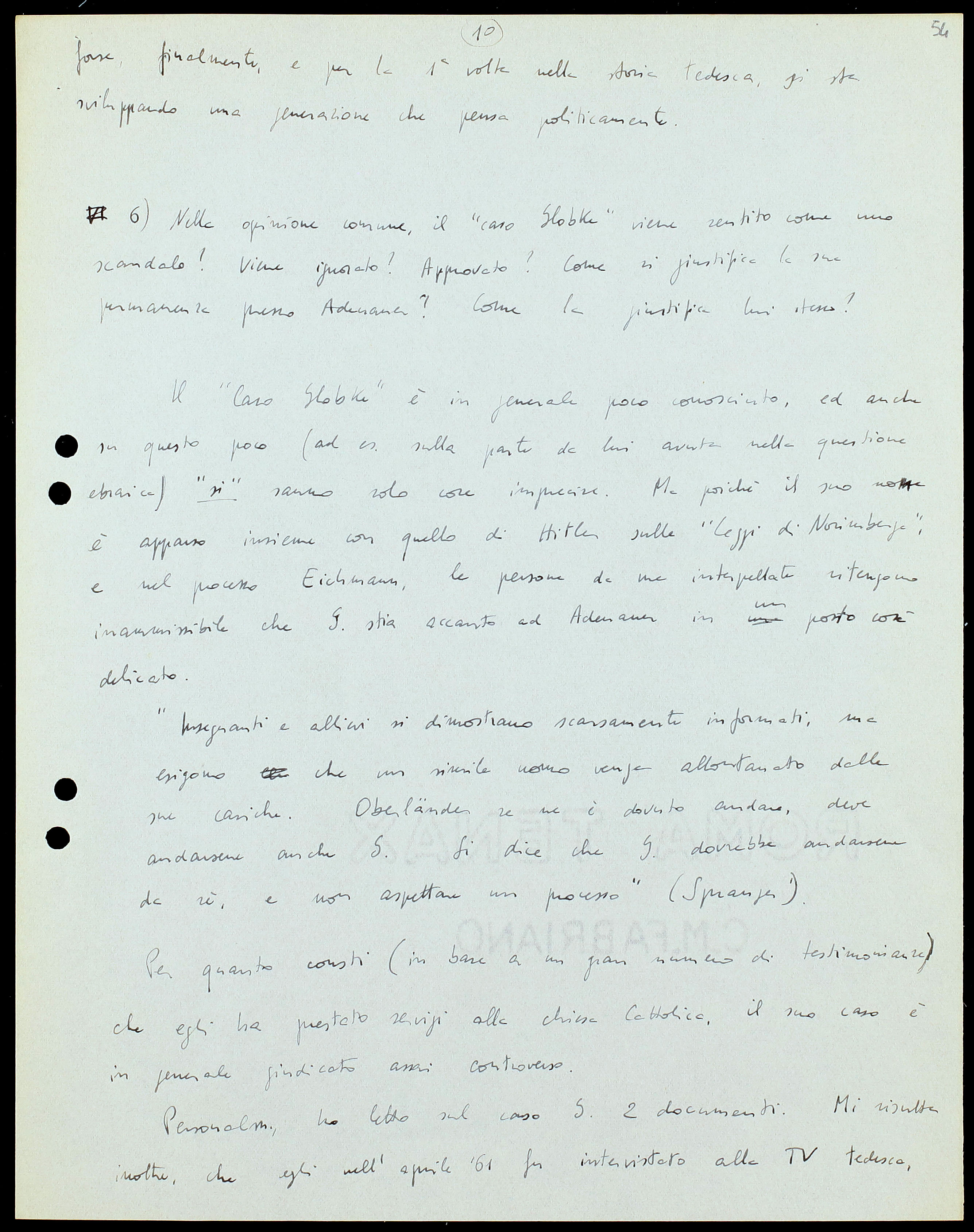 6) Nella opinione comune, il “caso Globke”[22] viene sentito come uno scandalo? Viene ignorato? Approvato? Come si giustifica la sua permanenza presso Adenauer? Come la giustifica lui stesso?