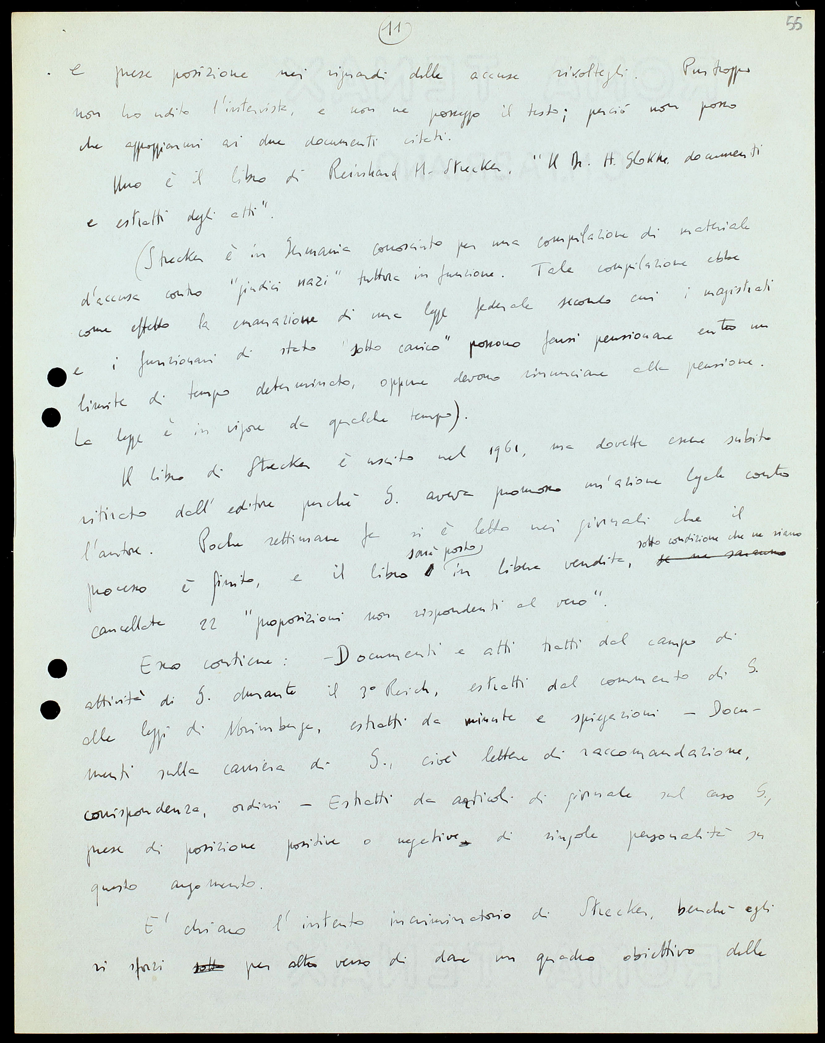 (Strecker è in Germania conosciuto per una compilazione di materiale d’accusa contro “giudizi nazi” tuttora in funzione. Tale compilazione ebbe come effetto la emanazione di una legge federale secondo cui i magistrati e i funzionari di stato “sotto carico” possono farsi pensionare entro un limite di tempo determinato, oppure devono rinunciare alla pensione. La legge è in vigore da qualche tempo).[25]