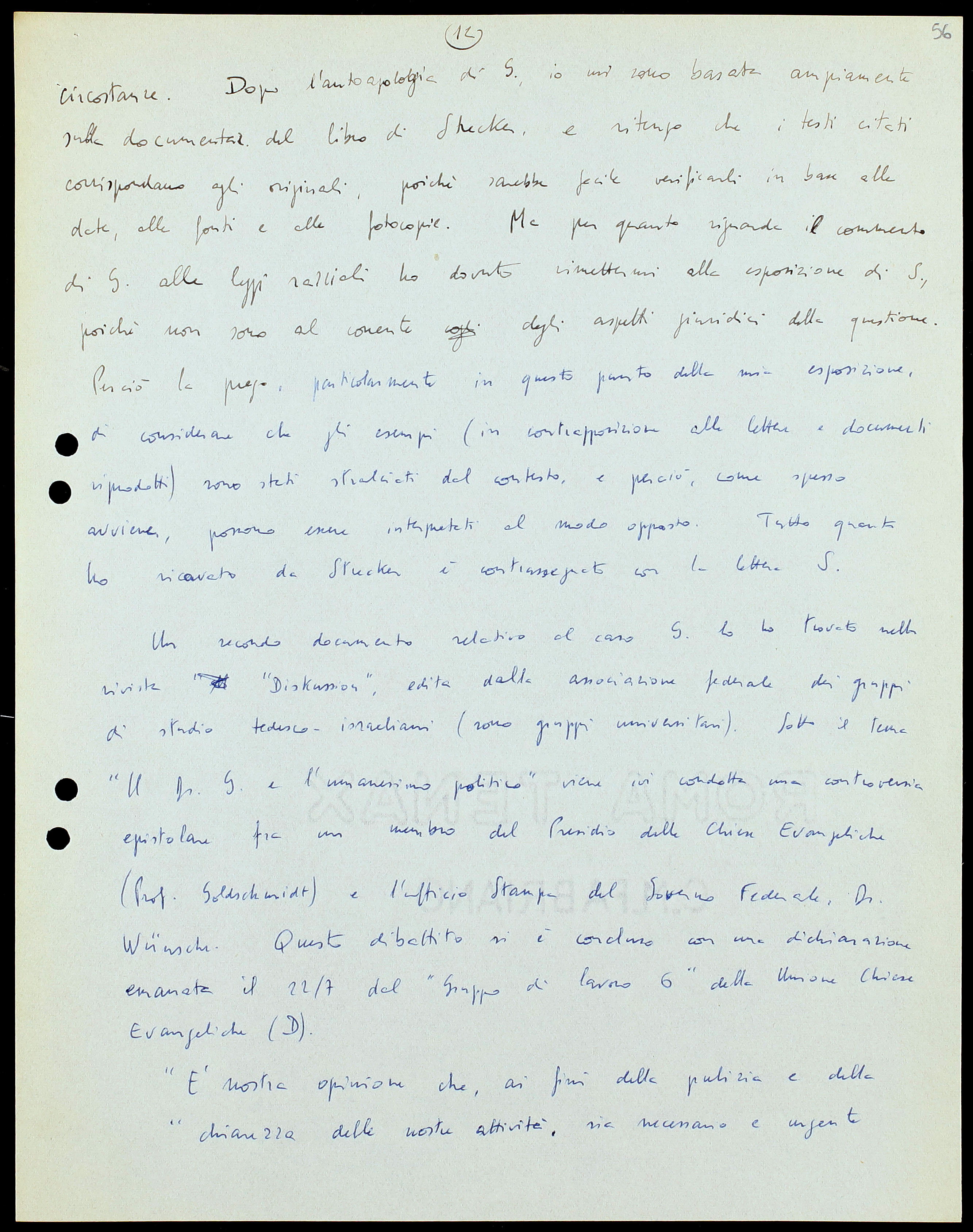 Un secondo documento relativo al caso G. lo ho trovato nella rivista «Diskussion», edita dalla associazione federale dei gruppi di studio tedesco-israeliani (sono gruppi universitari).[28] Sotto il tema “Il Dr. G. e l’umanesimo politico” viene ivi condotta una controversia epistolare fra un membro del Presidio delle Chiese Evangeliche (Prof. Goldschmidt)[29] e l’ufficio Stampa del Governo Federale, Dr. Wünsche. Questo dibattito si è concluso con una dichiarazione emanata il 22/7 dal “Gruppo di lavoro 6” della Unione Chiese Evangeliche (D).[30]