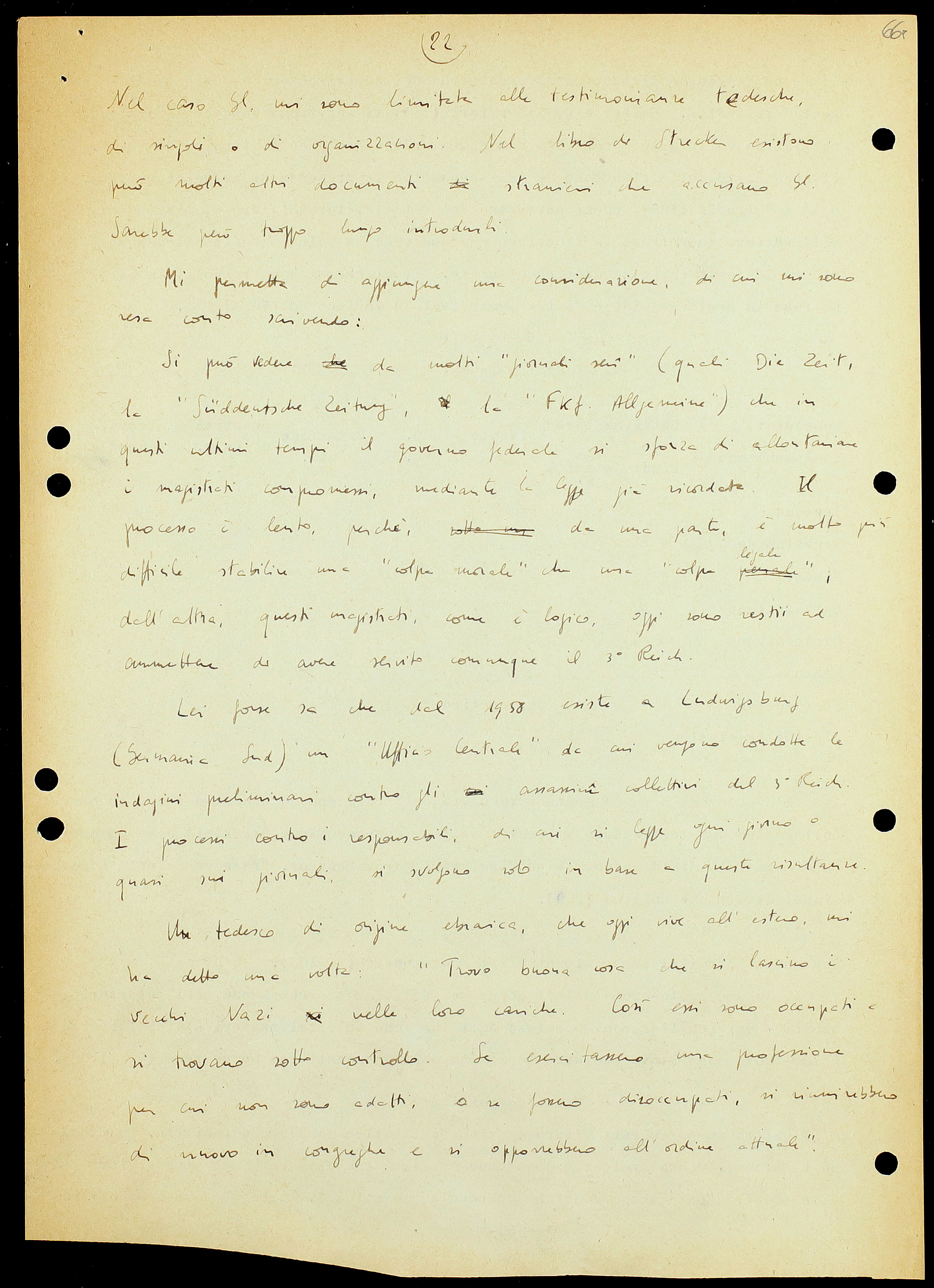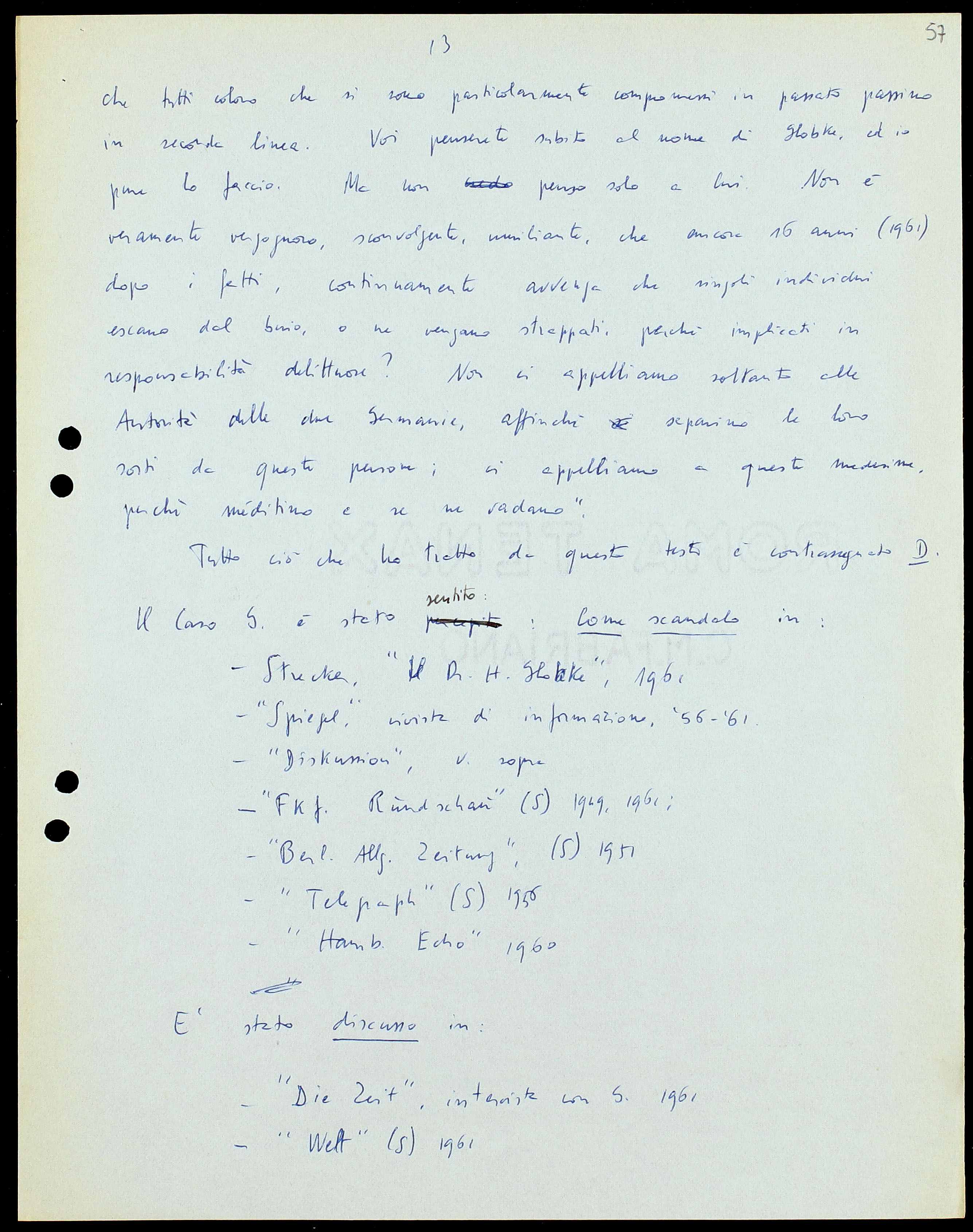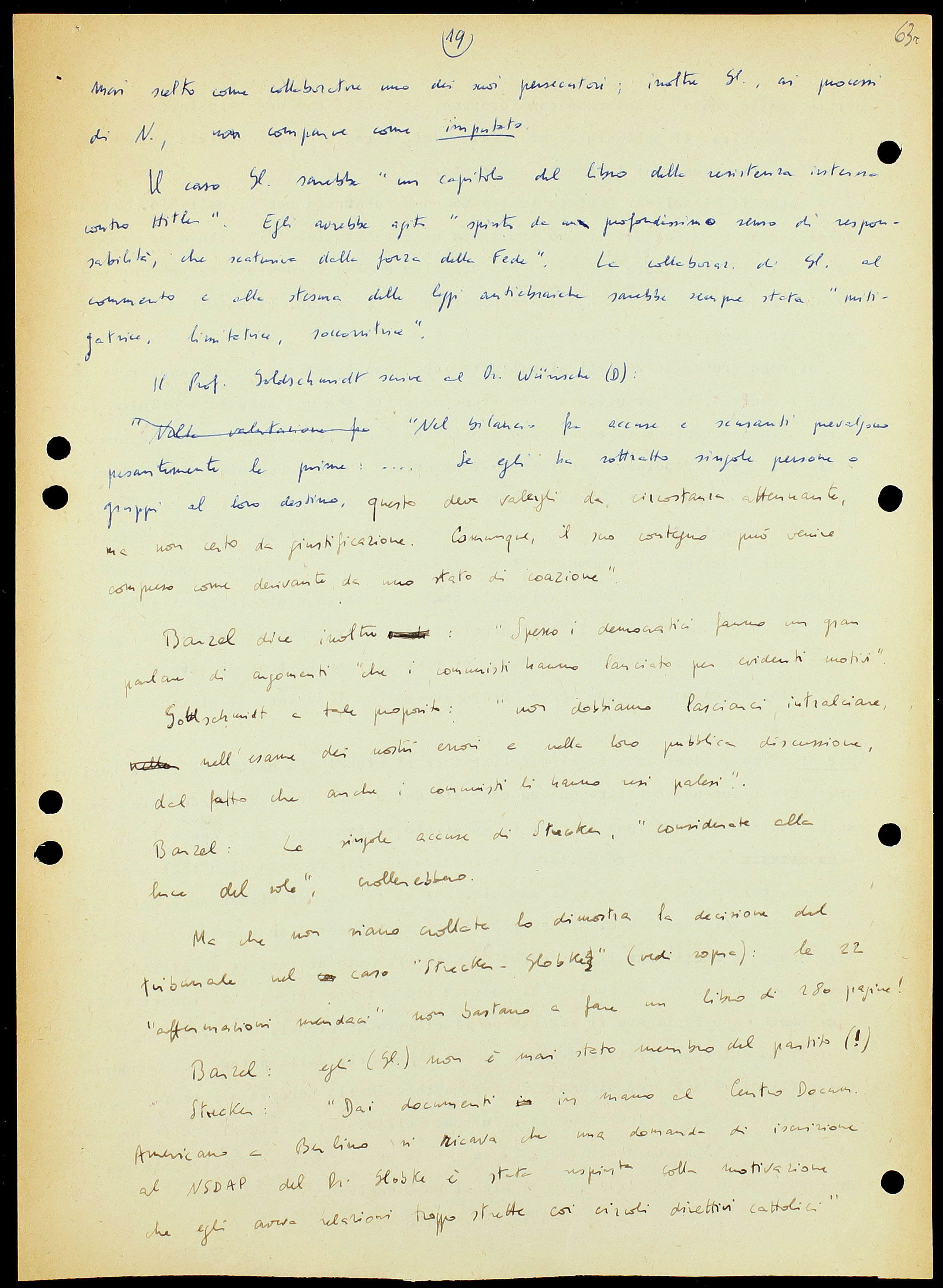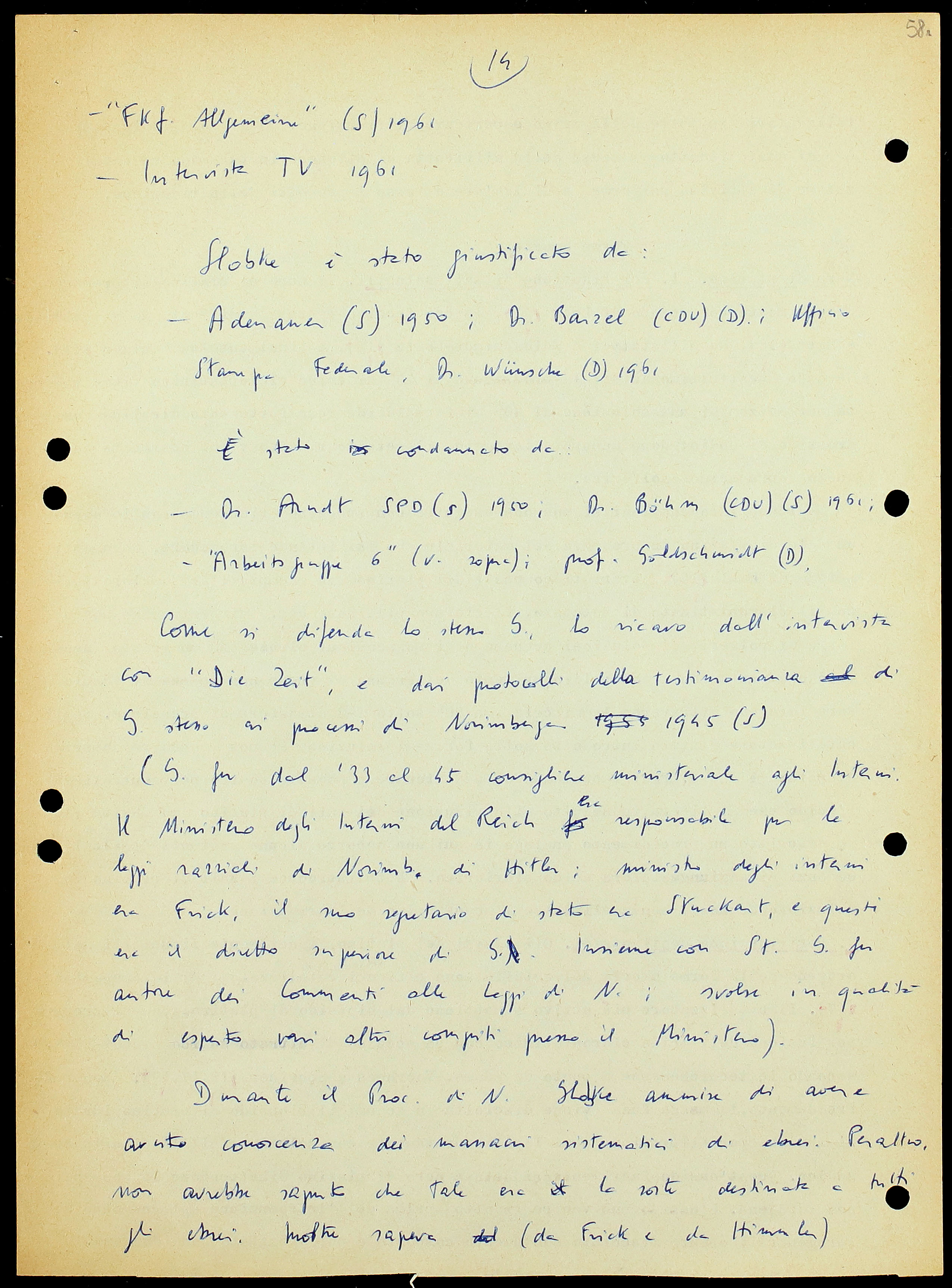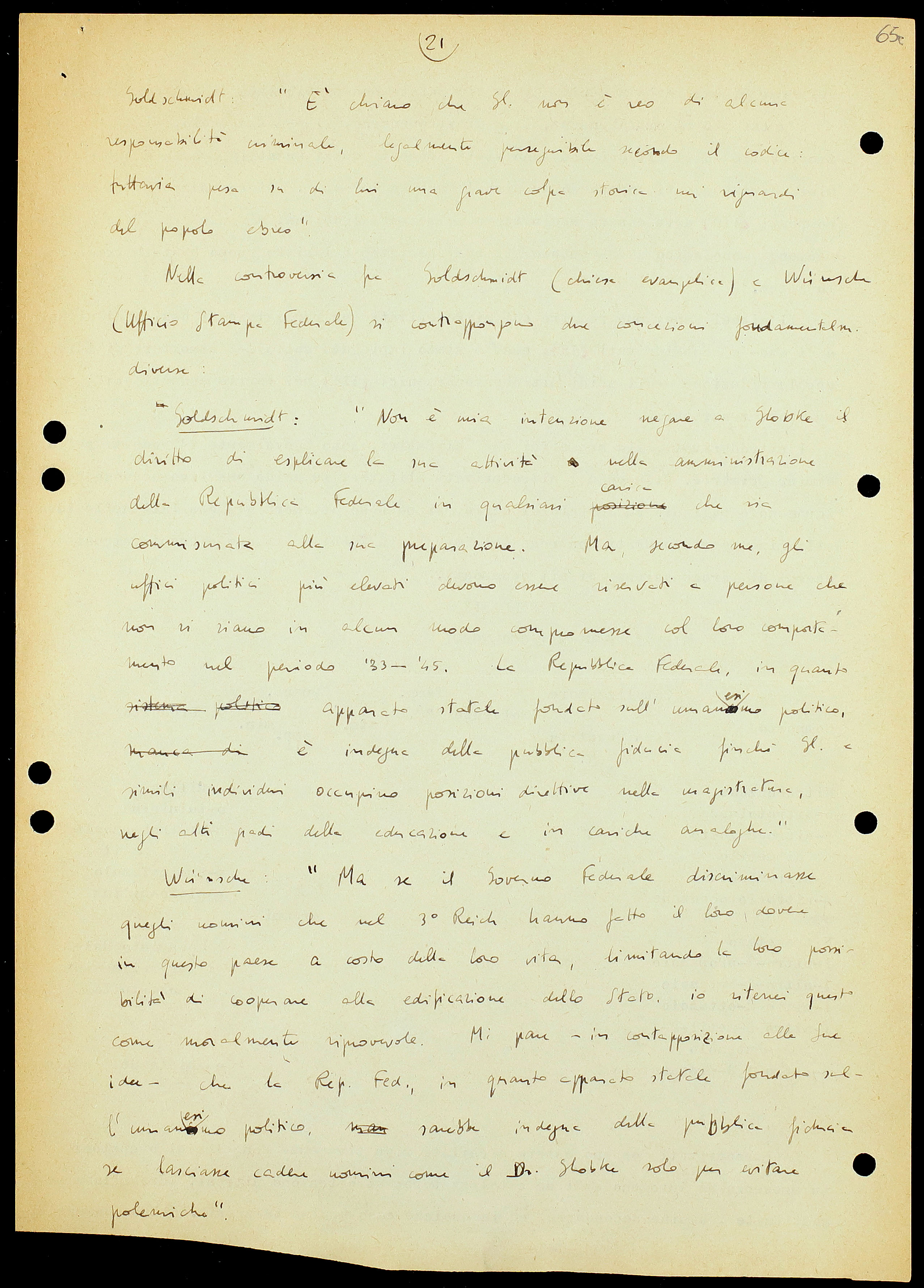 – Goldschmidt: «Non è mia intenzione negare a Globke il diritto di esplicare la sua attività nella amministrazione della Repubblica Federale in qualsiasi carica che sia commisurata alla sua preparazione. Ma, secondo me, gli uffici politici più elevati[38] devono essere riservati a persone che non si siano in alcun modo compromesse col loro comportamento nel periodo ’33-’45. La Repubblica Federale, in quanto apparato statale fondato sull’umanesimo politico, è indegna della pubblica fiducia finché Gl. e simili individui occupino posizioni direttive nella magistratura, negli alti gradi della educazione e in cariche analoghe».