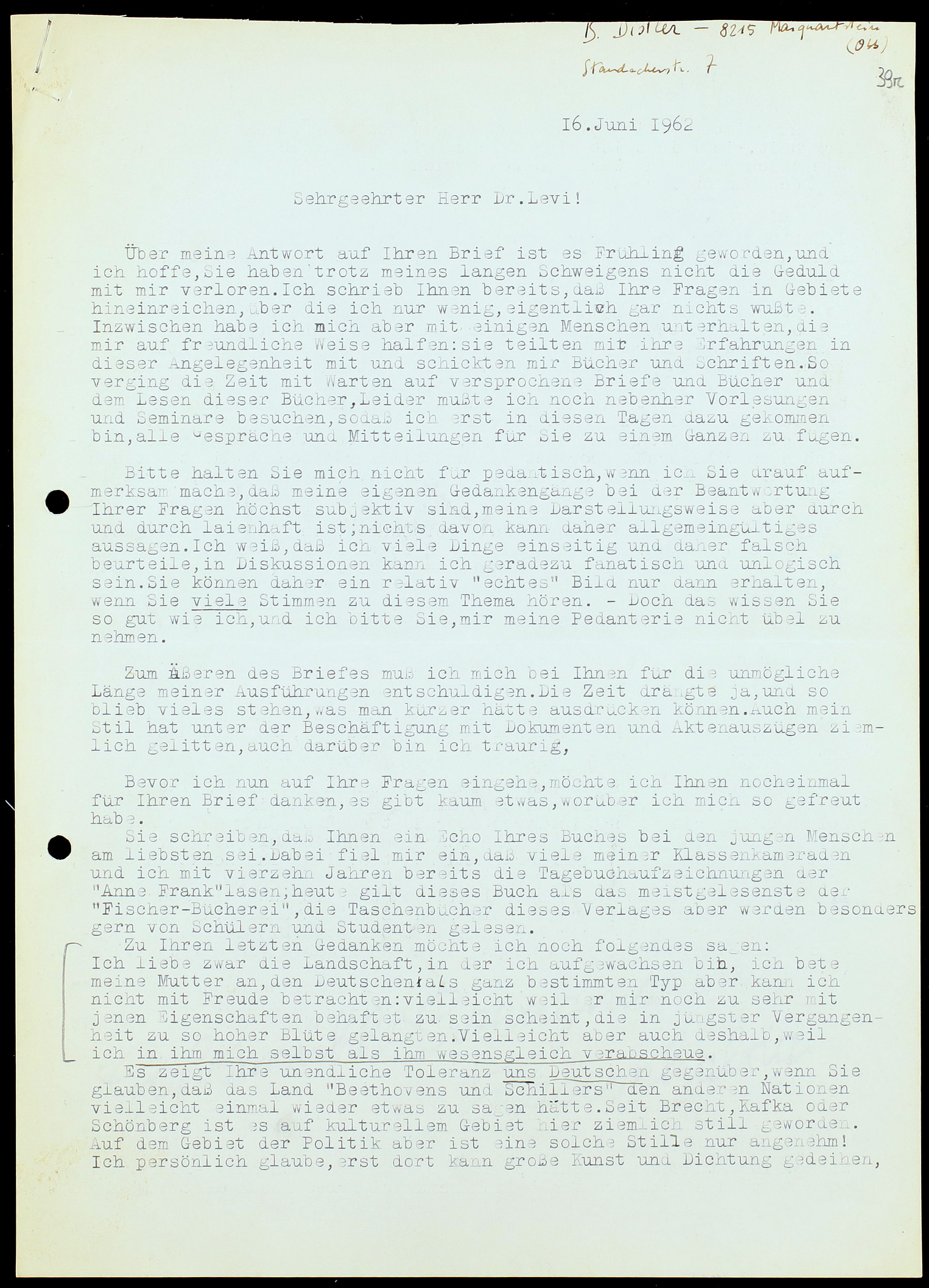 118. Brigitte Distler a Primo Levi, 16 giugno 1962