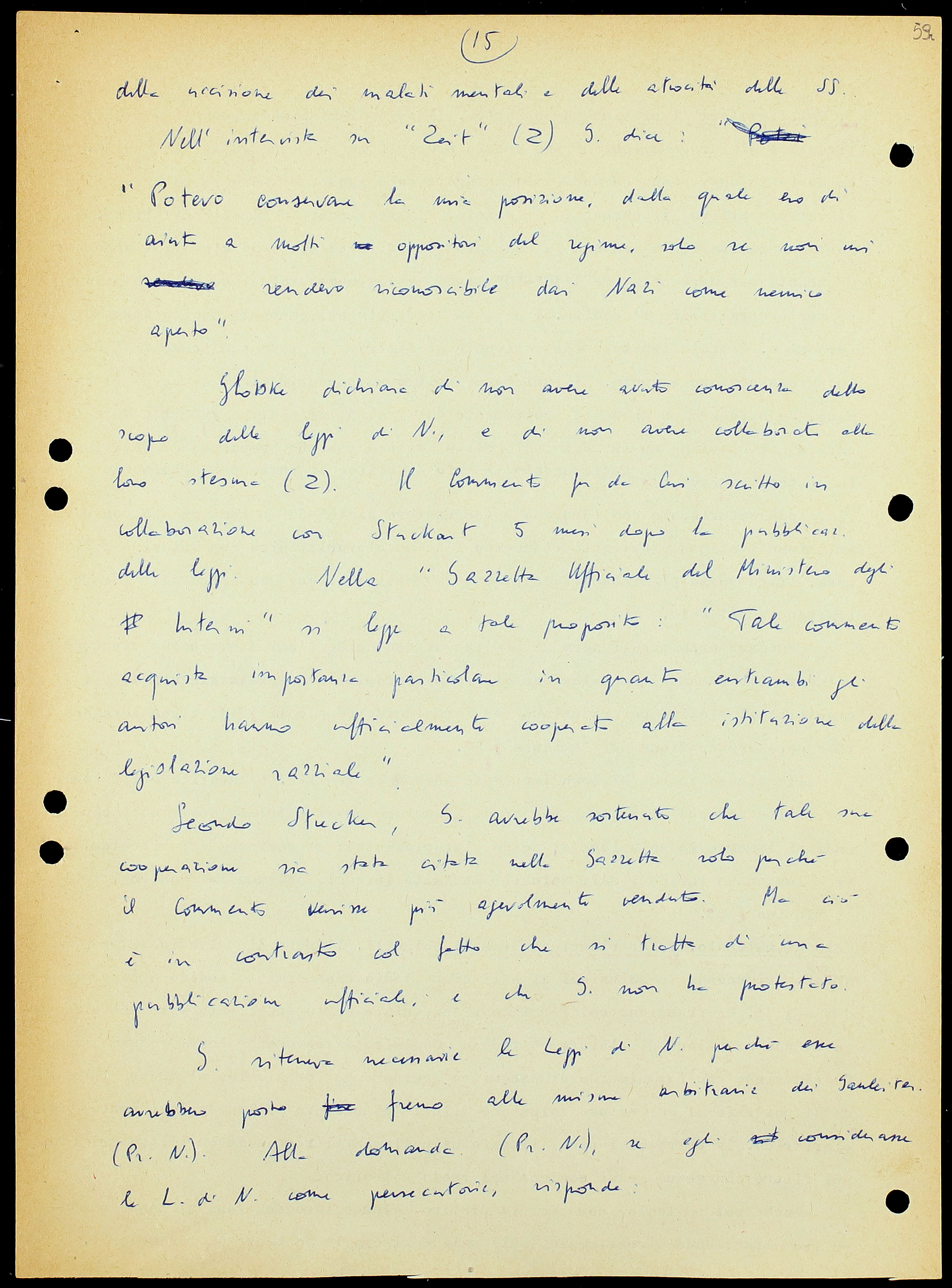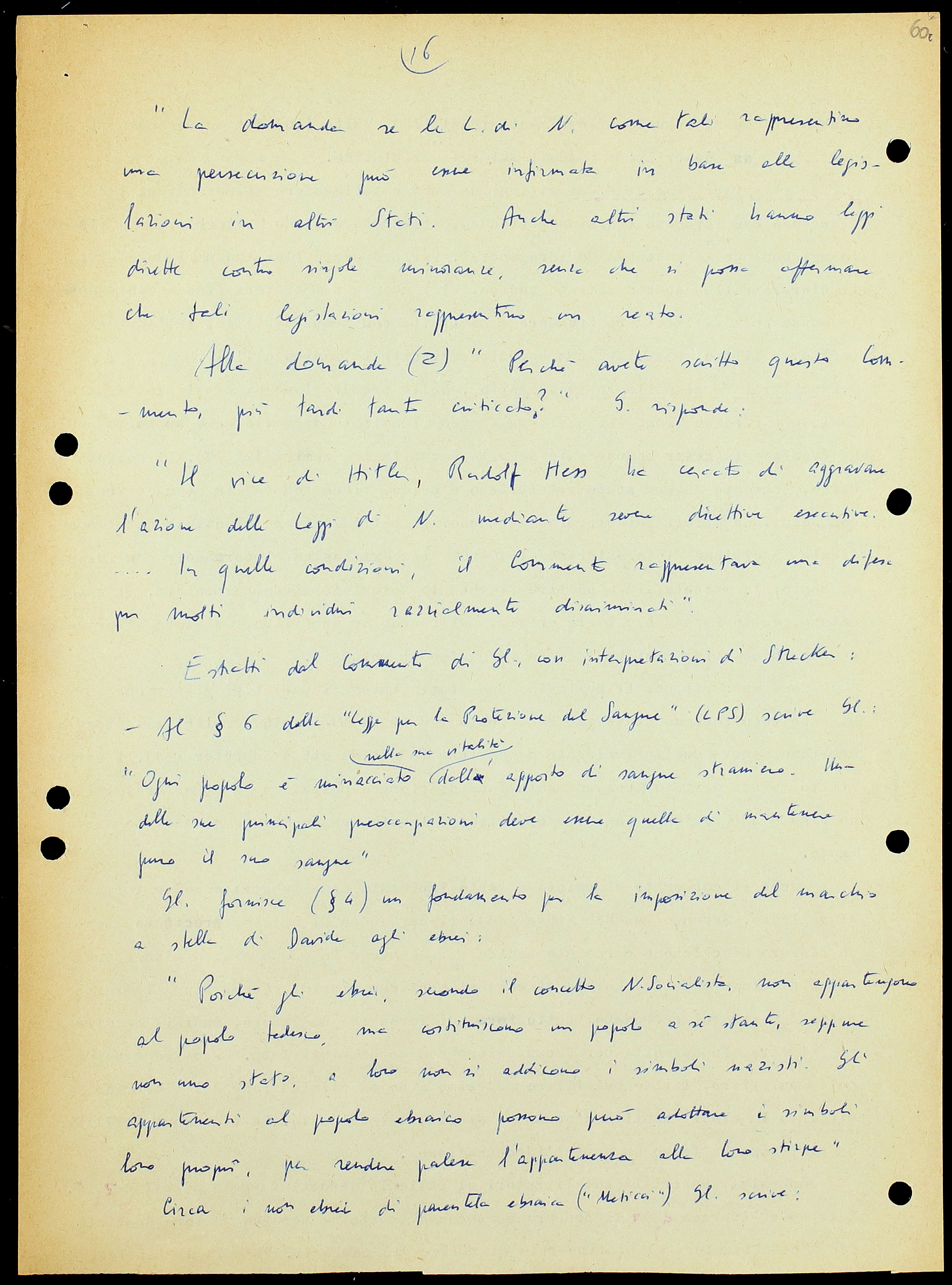 Alla domanda: «Si è affermato che il Suo commento, in vari punti, conduce a conseguenze anche più severe per i colpiti che le leggi di Norimberga: cosa risponde a questa accusa?» Gl. risponde: «Essa non corrisponde a verità. Ma naturalmente io non avrei potuto indurre in difficoltà i consultatori del Commento introducendovi ipotesi che in pratica non venivano seguite».
