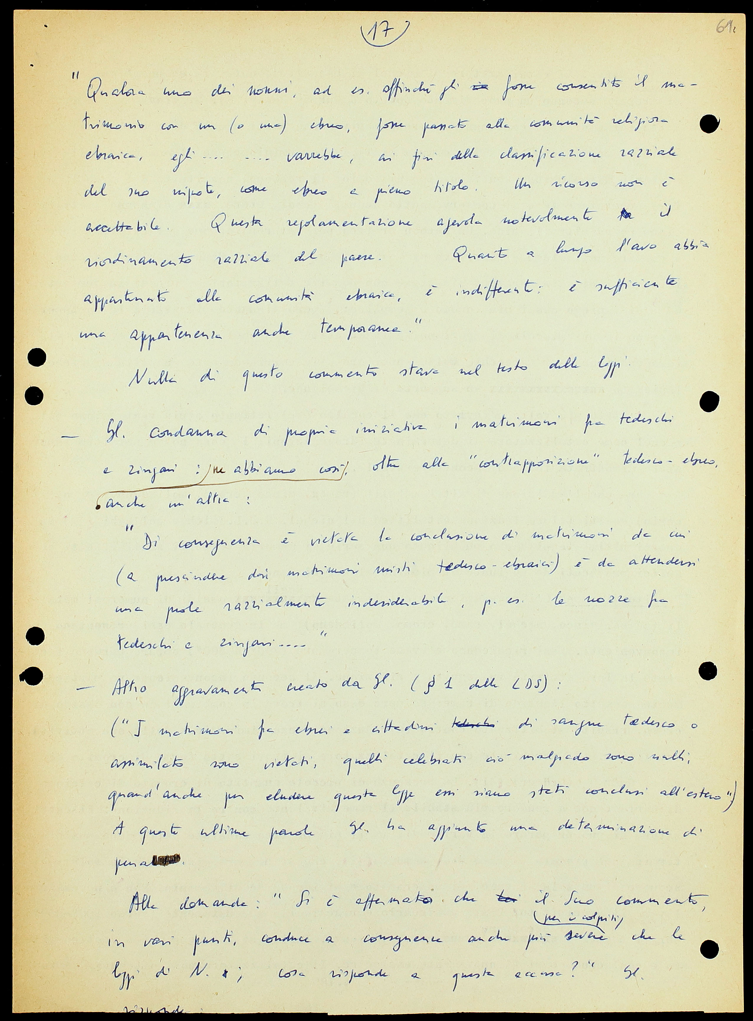 («I matrimoni fra ebrei e cittadini di sangue tedesco o assimilato sono vietati, quelli celebrati ciò malgrado sono molti, quand’anche per eludere questa legge essi siano stati conclusi all’estero»). A queste ultime parole Gl. ha aggiunto una determinazione di pena.