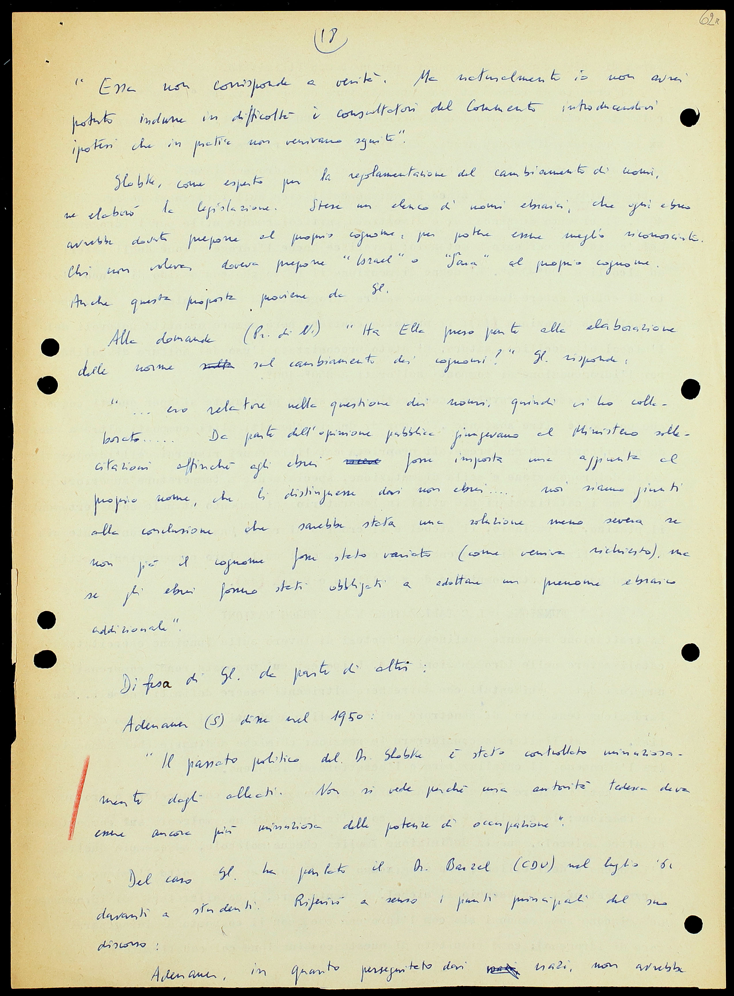 Alla domanda (Processo di Norimberga) «Ha Ella preso parte alla elaborazione delle norme sul cambiamento dei cognomi?» Gl. risponde: «…ero relatore nella questione dei nomi, quindi vi ho collaborato…Da parte dell’opinione pubblica giungevano al Ministero sollecitazioni affinché agli ebrei fosse imposta una aggiunta al proprio nome, che li distinguesse dai non ebrei…noi siamo giunti alla conclusione che sarebbe stata una soluzione meno severa se non già il cognome fosse stato variato (come veniva richiesto), ma se gli ebrei fossero stati obbligati a adottare un prenome ebraico addizionale».