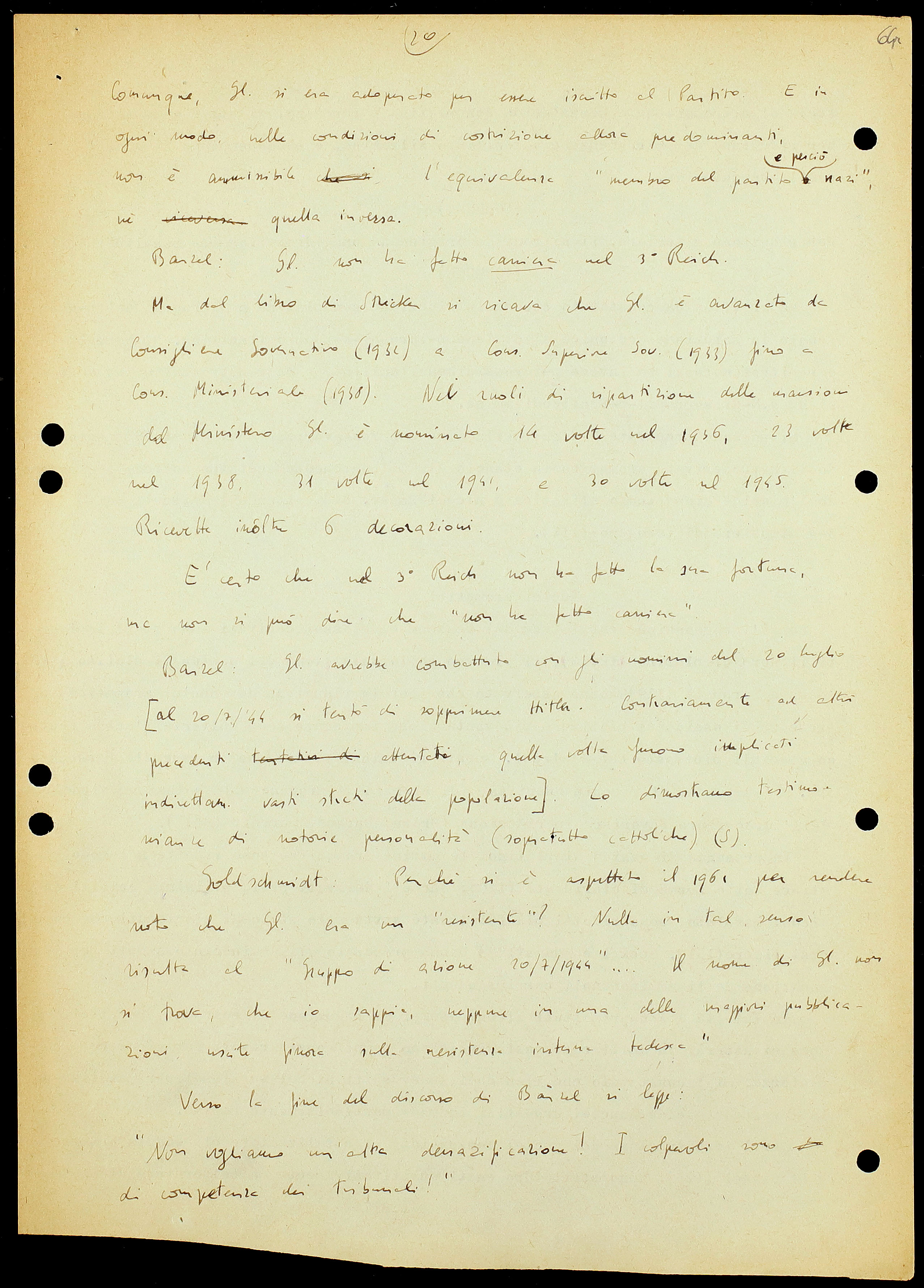 Barzel: Gl. avrebbe combattuto con gli uomini del 20 luglio [al 20/7/’44 si tentò di sopprimere Hitler. Contrariamente ad altri precedenti attentati, quella volta furono implicati indirettamente vasti strati della popolazione]. Lo dimostrano testimonianze di notorie personalità (soprattutto cattoliche) (S).