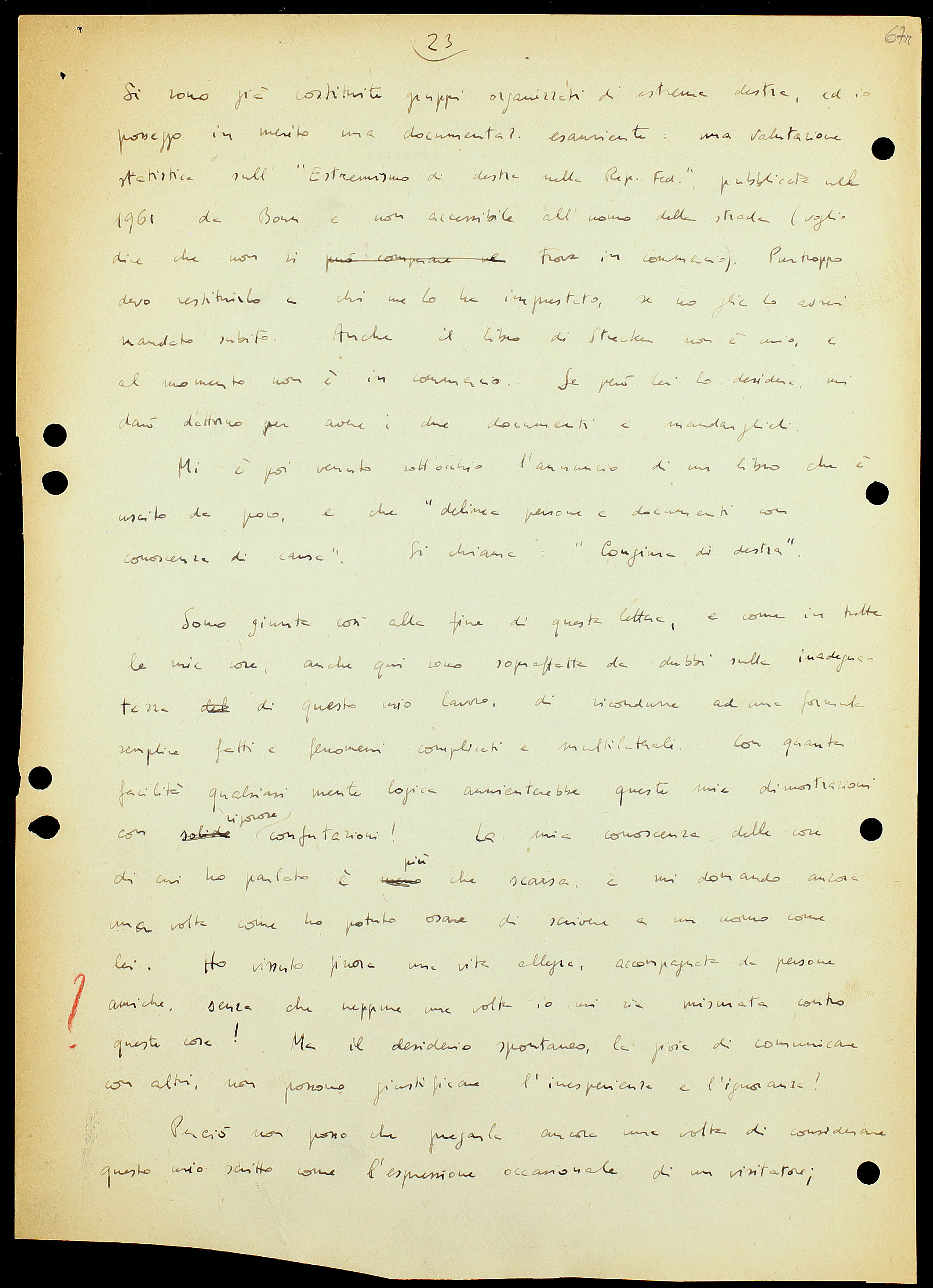 Si sono già costituiti gruppi organizzati di estrema destra, ed io posseggo in merito una documentazione esauriente: una valutazione statistica sull’«Estremismo di destra nella Repubblica Federale», pubblicata nel 1961 da Bonn e non accessibile all’uomo della strada (voglio dire che non si trova in commercio).[40] Purtroppo devo restituirlo a chi me lo ha imprestato, se no glielo avrei mandato subito. Anche il libro di Strecker non è mio, e al momento non è in commercio. Se però Lei lo desidera mi darò d’attorno per avere i due documenti e mandarglieli.[41]