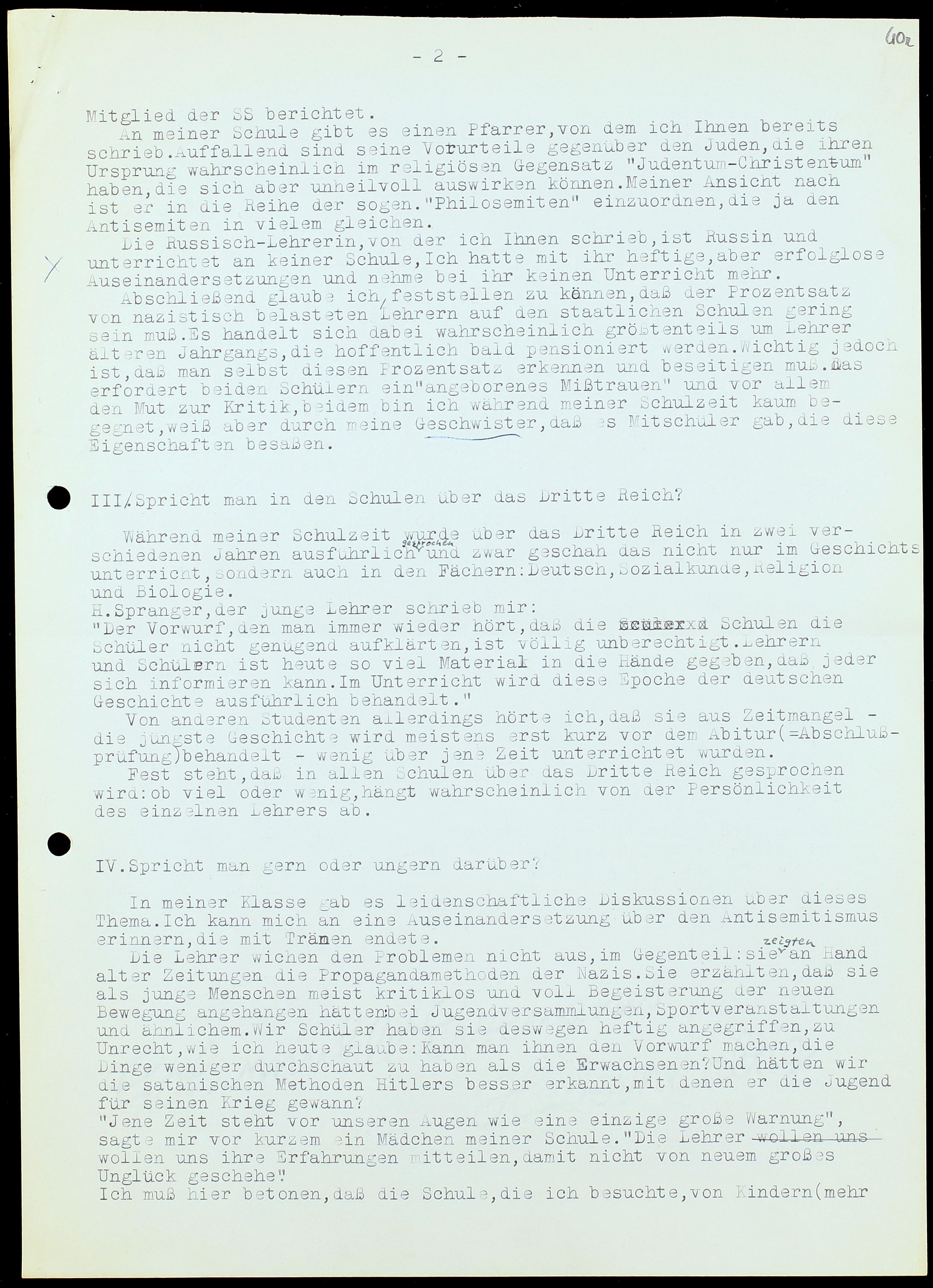 Fest steht, daß in allen Schulen über das Dritte Reich gesprochen wird: ob viel oder wenig, hängt wahrscheinlich von der Persönlichkeit des einzelnen Lehrers ab.