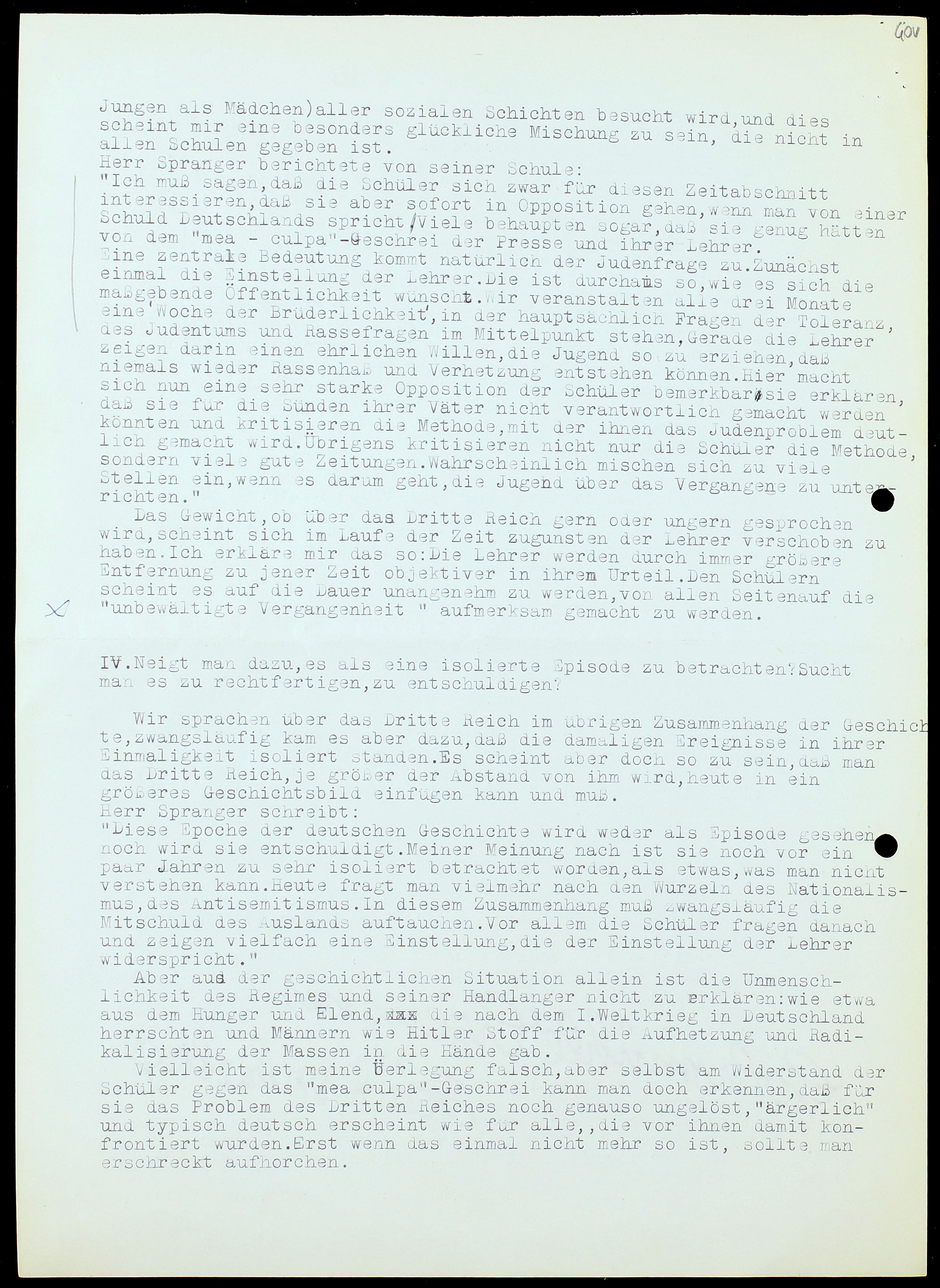 „Ich muß sagen, daß die Schüler sich zwar für diesen Zeitabschnitt interessieren, daß sie aber sofort in Opposition gehen, wenn man von einer Schuld Deutschlands spricht. Viele behaupten sogar, daß sie genug hätten von dem “mea-culpa” – Geschrei der Presse und ihrer Lehrer.