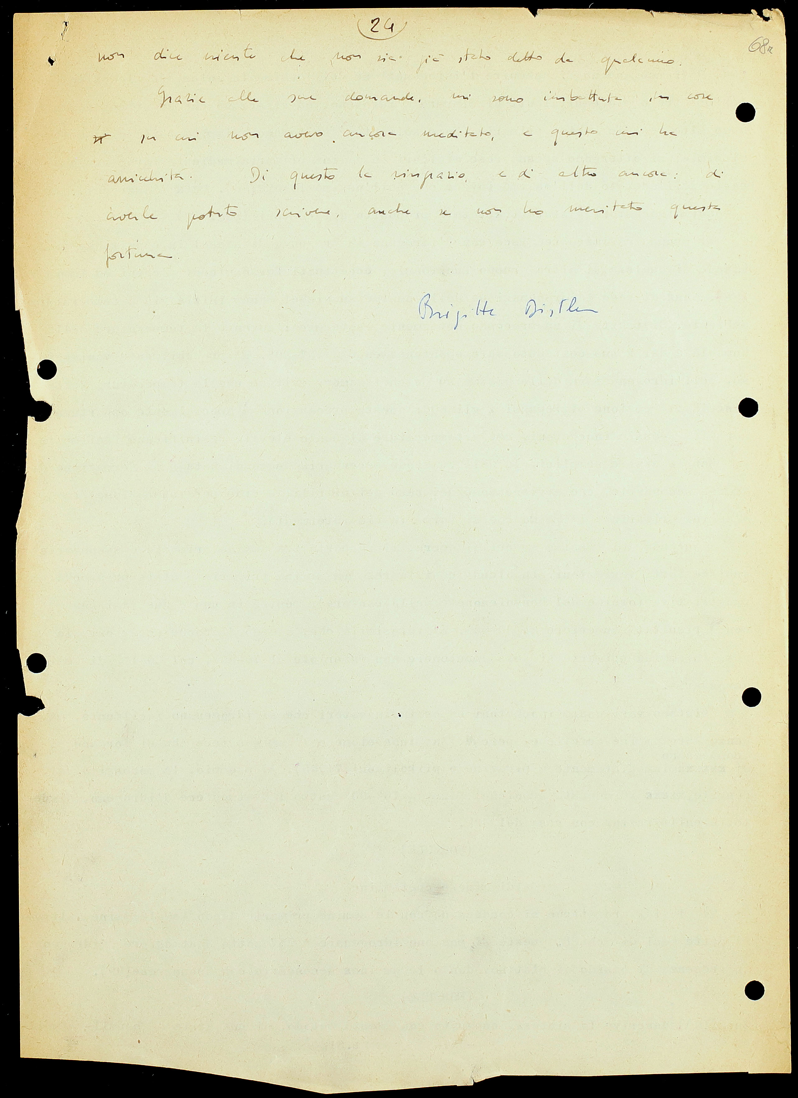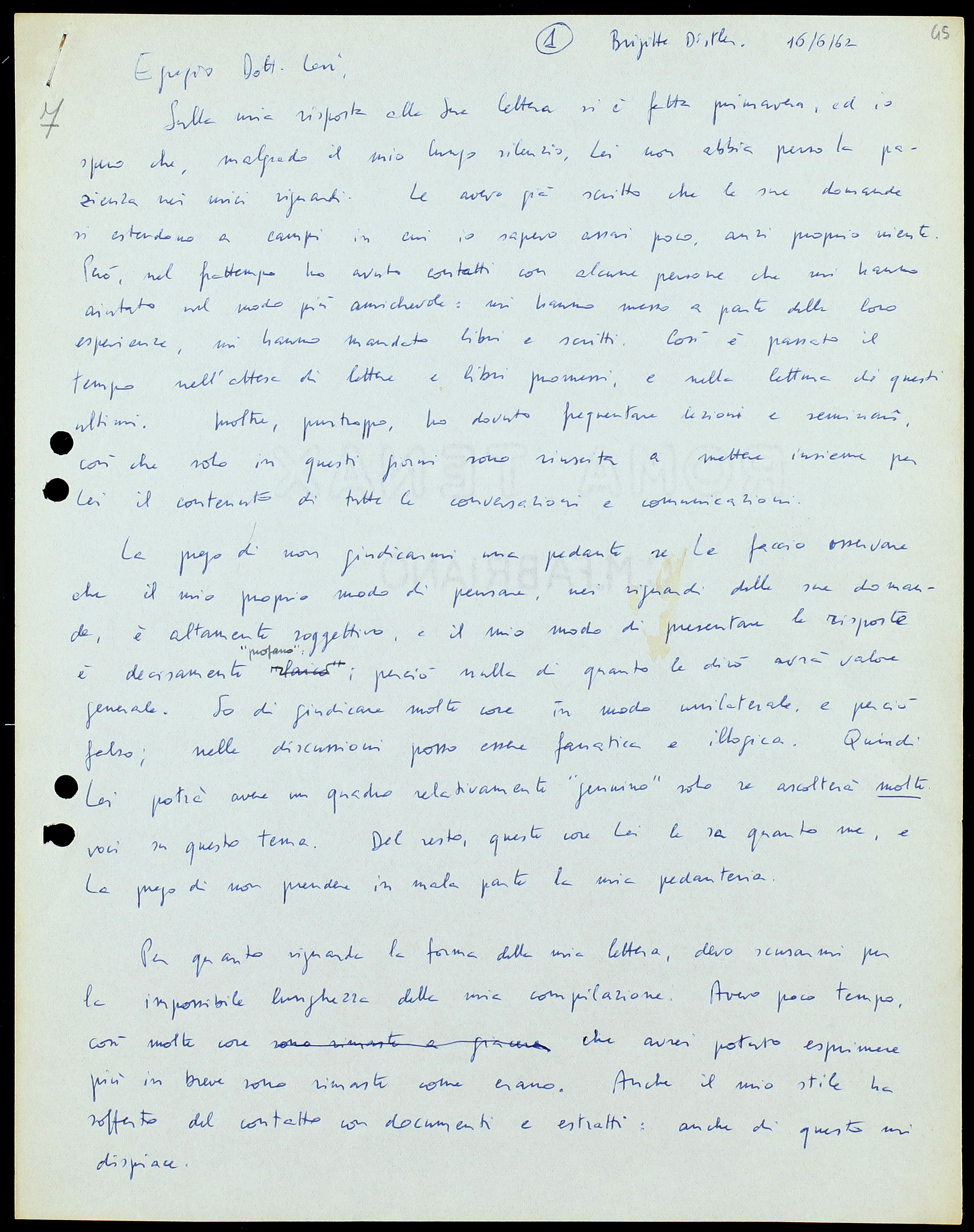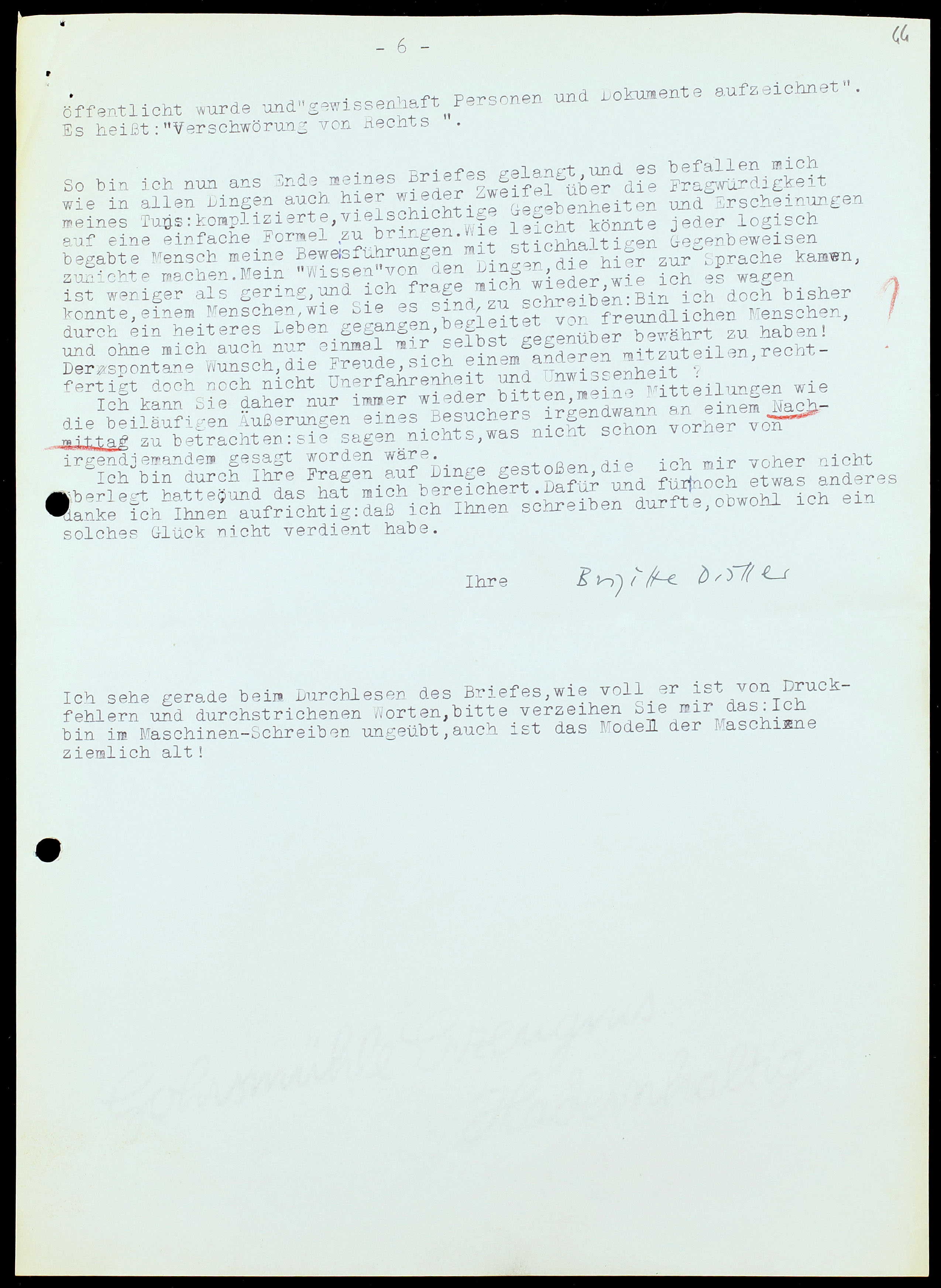 Mi accorgo ora, rileggendo la lettera, di quanto sia piena di refusi e di parole cancellate. La prego di scusarmi: non ho molta pratica con la macchina da scrivere, e inoltre il modello della macchina è piuttosto vecchio!