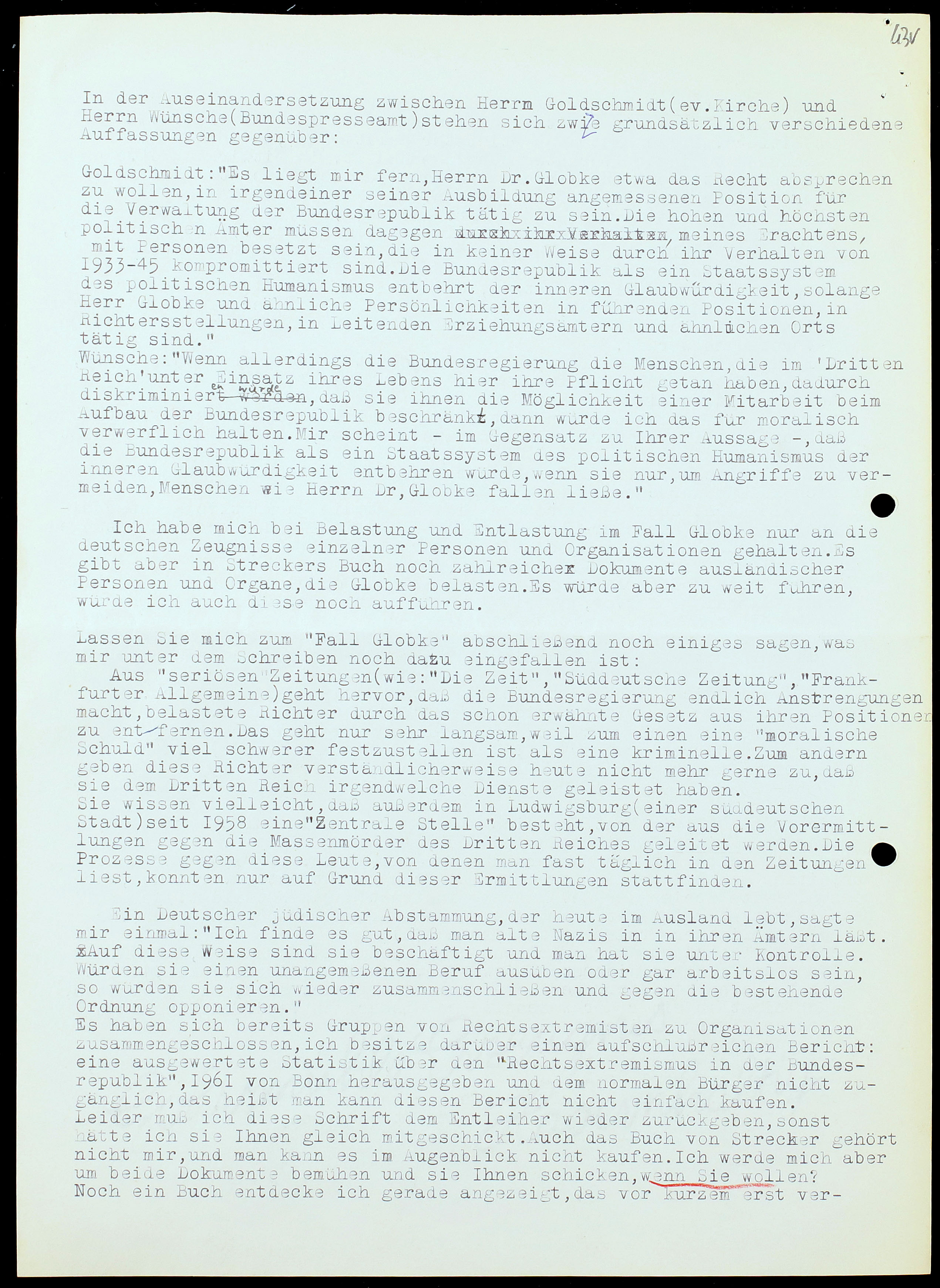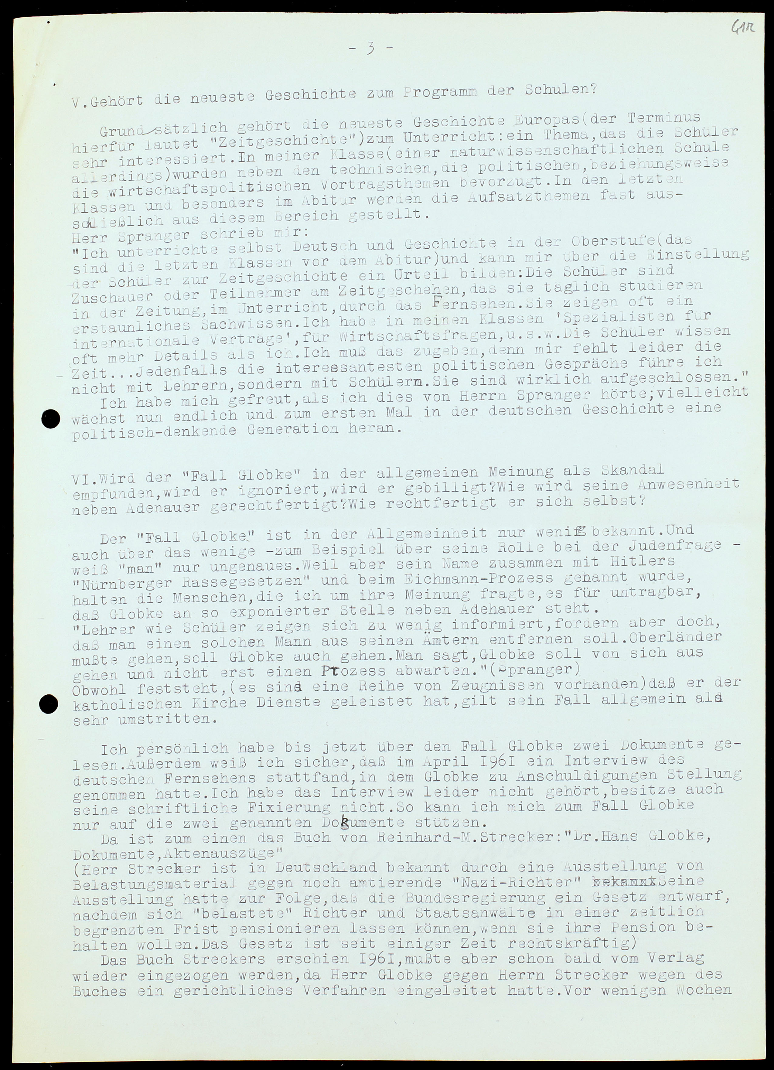 „Lehrer wie Schüler zeigen sich zu wenig informiert, fordern aber doch, daß man einen solchen Mann aus seinen Ämtern entfernen soll. Oberländer mußte gehen,[23] soll Globke auch gehen. Man sagt, Globke soll von sich aus gehen und nicht erst einen Prozess abwarten.” (Spranger)